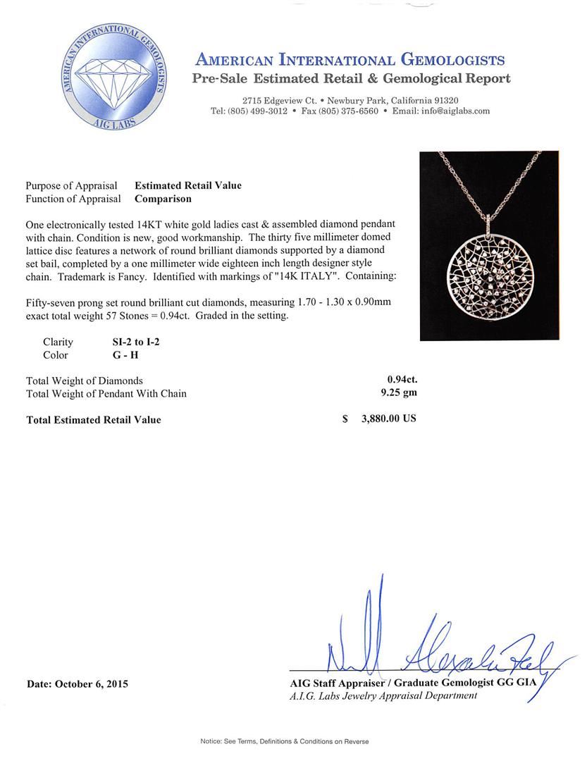 One electronically tested 14KT white gold ladies cast & assembled diamond pendant with chain. The thirty five millimeter domed lattice disc features a network of round brilliant diamonds supported by a diamond set bail, completed by a one millimeter wide eighteen inch length designer style chain. Trademark is Fancy. Identified with markings of "14K ITALY". Condition is new, good workmanship. Containing: Fifty-Seven prong set round brilliant cut diamonds, measuring 1.70 - 1.30 x 0.90mm exact total weight 57 Stones = 0.94ct. Graded in the setting. Clarity: SI-2 to I-2. Color: G - H. Total Weight of Diamonds 0.94ct. Total Weight of Pendant With Chain 9.25gm. AIG Appraised at $3,880.00.