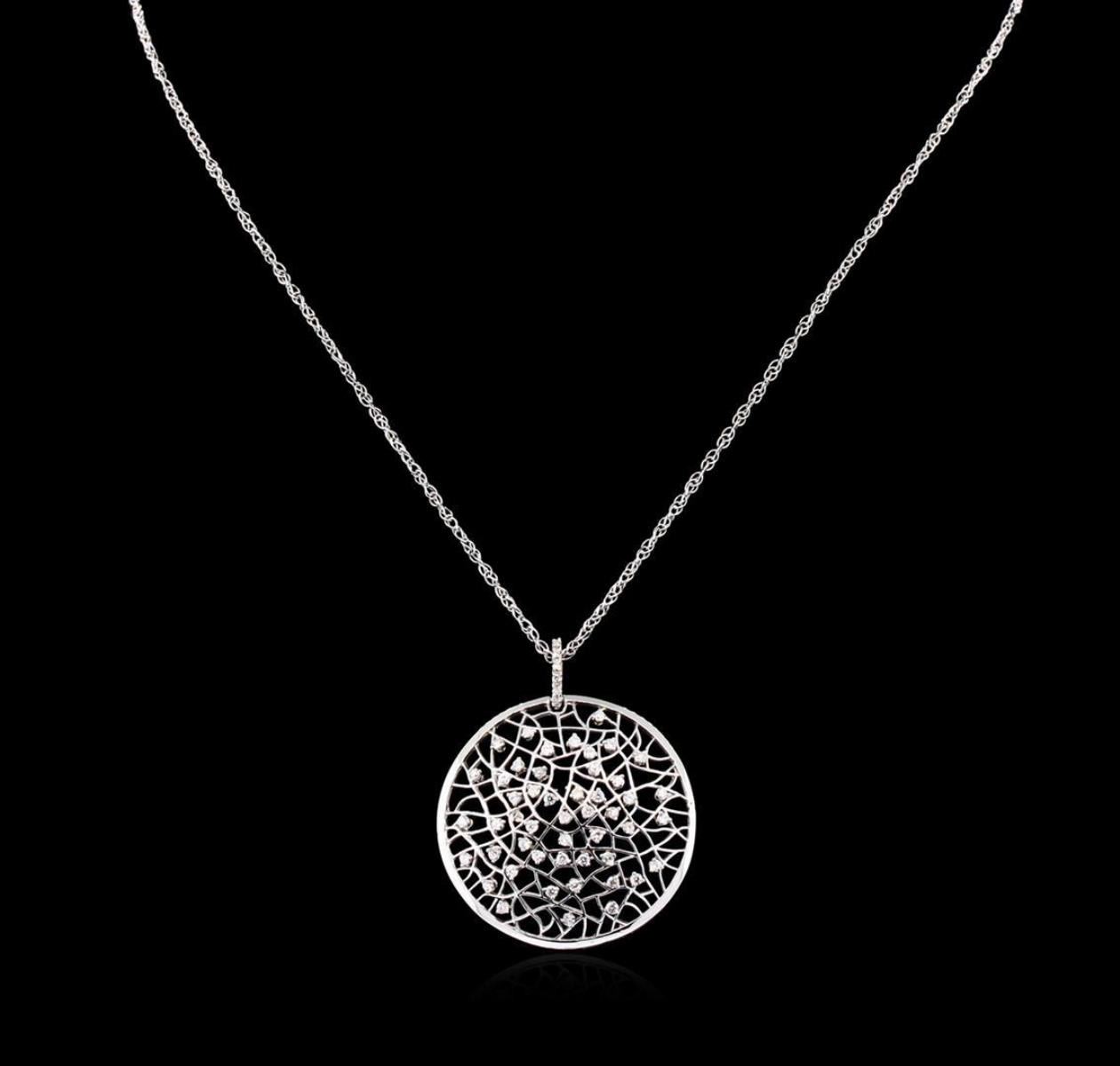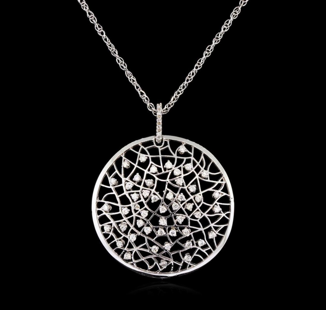 One electronically tested 14KT white gold ladies cast & assembled diamond pendant with chain. The thirty five millimeter domed lattice disc features a network of round brilliant diamonds supported by a diamond set bail, completed by a one millimeter wide eighteen inch length designer style chain. Trademark is Fancy. Identified with markings of "14K ITALY". Condition is new, good workmanship. Containing: Fifty-Seven prong set round brilliant cut diamonds, measuring 1.70 - 1.30 x 0.90mm exact total weight 57 Stones = 0.94ct. Graded in the setting. Clarity: SI-2 to I-2. Color: G - H. Total Weight of Diamonds 0.94ct. Total Weight of Pendant With Chain 9.25gm. AIG Appraised.
