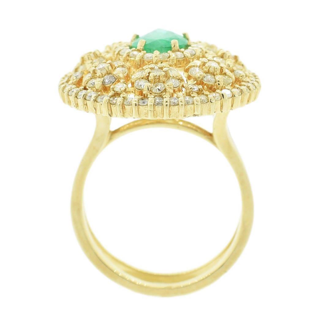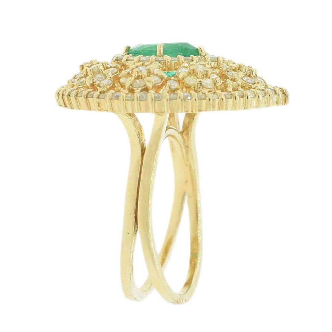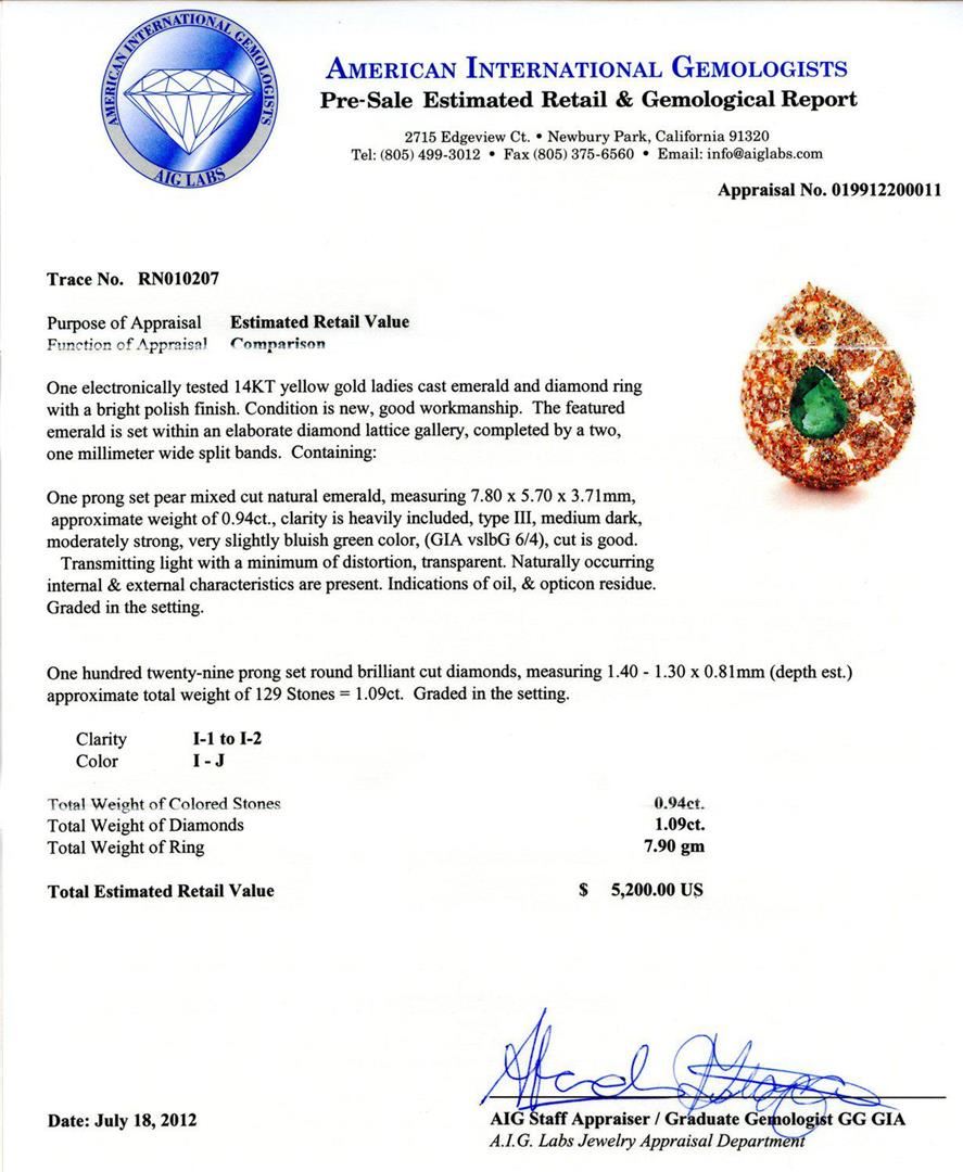 One electronically tested 14KT yellow gold ladies cast emerald and diamond ring with a bright polish finish. Condition is new, good workmanship. The featured emerald is set within an elaborate diamond lattice gallery, completed by a two, one millimeter wi