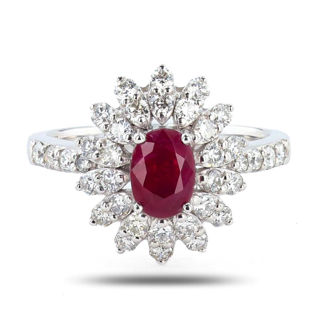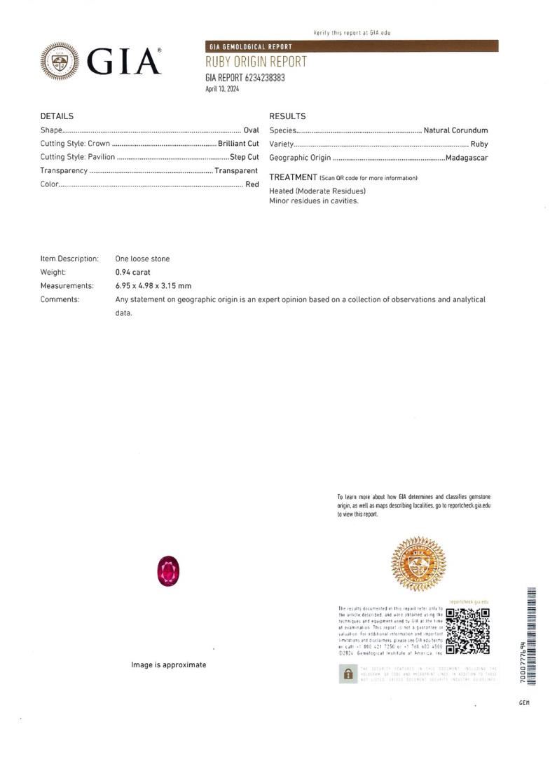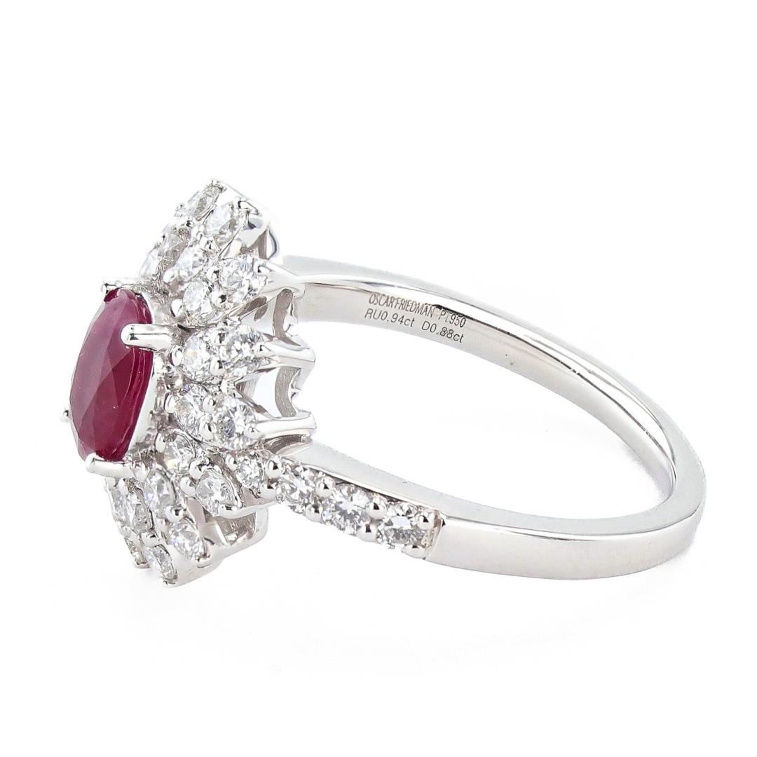 One polished, stamped, and tested platinum ring marked Oscar Friedman. The ring is mounted with: 1 genuine GIA certified ruby center stone weighing 0.94 carat, and 36 genuine round diamonds weighing approximately 0.88 carats. This item weighs 7.0 grams, condition is new, excellent workmanship. #MAIN GEMSTONE# GIA Report No.: 6234238383 Species: Natural Corundum Variety: Ruby Origin: Madagascar Shape: Oval Cutting Style: Brilliant Cut Crown, Step Cut Pavilion Measurements: 6.95 x 4.98 x 3.15mm Weight: 0.94 carat Color: Red Transparency: Transparent Treatment: Heat with Residues Refractive Index: 1.762 - 1.770 DR Birefringence: 0.008 - 0.010 Hardness: 9 #ADJACENT GEMSTONES ON RING# Identity: Natural Diamond Shape: Round Cutting Style: Brilliant Cut Quantity: 36 Diamonds Measurements: 1.5 - 2.0mm Total Weight: 0.88 carats Clarity Grade: VS2-SI2 Color Grade: G-H Refractive Index: 2.417 Hardness: 10 RUBY WEIGHT: 0.94 ct TOTAL DIAMOND WEIGHT: 0.88 cts WEIGHT OF ITEM: 7.0 grams METAL: Platinum Size: 6 3/4