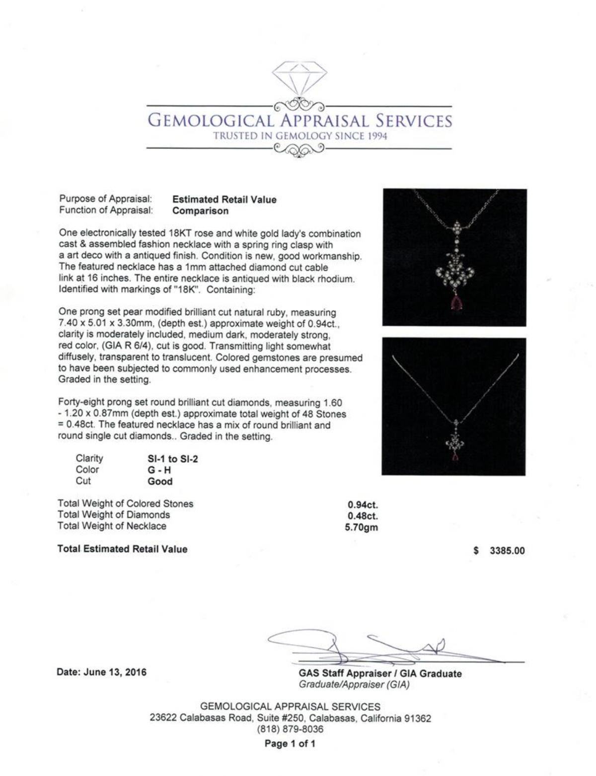 One electronically tested 18KT rose and white gold lady's combination cast & assembled fashion necklace with a spring ring clasp with a art deco with a antiqued finish. The featured necklace has a 1mm attached diamond cut cable link at 16 inches. The entire necklace is antiqued with black rhodium. Identified with markings of "18K". Condition is new, good workmanship. Containing: One prong set pear modified brilliant cut natural ruby, measuring 7.40 x 5.01 x 3.30mm, (depth est.) approximate weight of 0.94ct., clarity is moderately included, medium dark, moderately strong, red color, (GIA R 6/4), cut is good. Transmitting light somewhat diffusely, transparent to translucent. Colored gemstones are presumed to have been subjected to commonly used enhancement processes. Graded in the setting. Forty-Eight prong set round brilliant cut diamonds, measuring 1.60 - 1.20 x 0.87mm (depth est.) approximate total weight of 48 Stones = 0.48ct. The featured necklace has a mix of round brilliant and round single cut diamonds. Graded in the setting. Clarity: SI-1 to SI-2. Color: G - Good. Total Weight of Colored Stones 0.94ct. Total Weight of Diamonds 0.48ct. Total Weight of Necklace 5.70gm. GAS Appraised at $3,385.00.