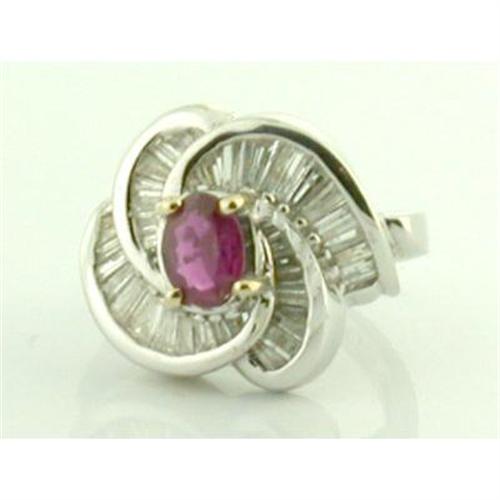 Beautiful swirl pattern 18k white gold band contains a fine 0.94ct ruby surrounded by 2.55tcw of brilliant diamond baguettes. Ring weighs 9.2 grams and is a size 5 and can be sized to fit. See our ring sizing policy for details. This fine ring is appraisal priced at $4999.00.