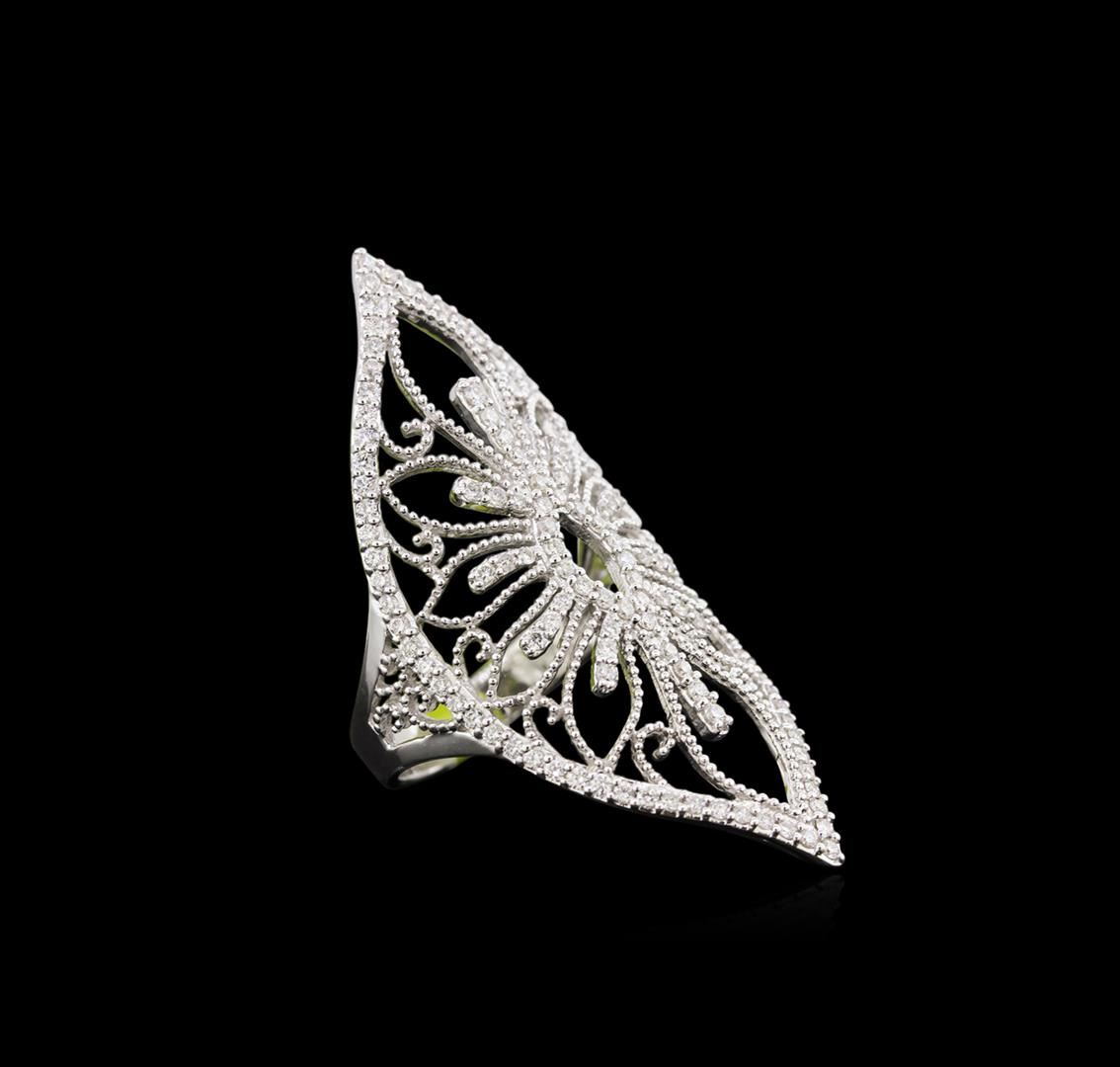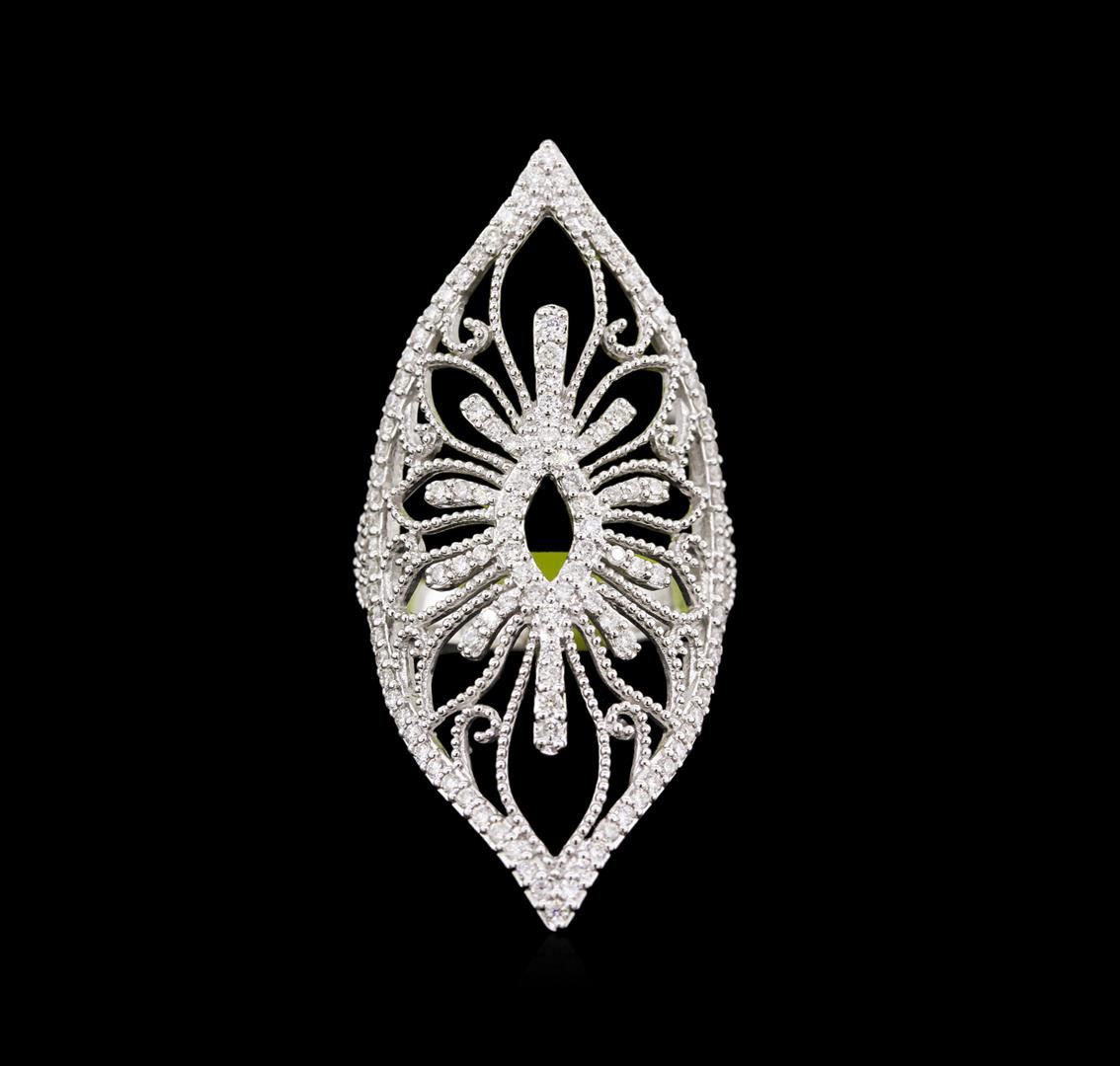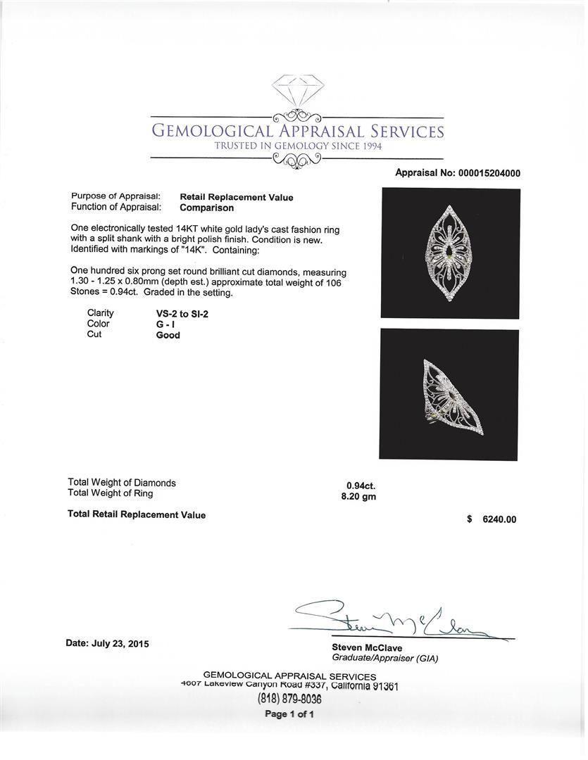 One electronically tested 14KT white gold lady's cast fashion ring with a split shank with a bright polish finish. Condition is new. Identified with markings of "14K". Containing: One hundred six prong set round brilliant cut diamonds, measuring 1.30 - 1.25 x 0.80mm (depth est.) approximate total weight of 106 Stones = 0.94ct. Graded in the setting. Clarity: VS-2 to SI-2. Color: G - I. Cut: Good. Total Weight of Diamonds: 0.94ct. Total Weight of Ring: 8.20 gm. Gemological Appraisal Services at $6,240.00.