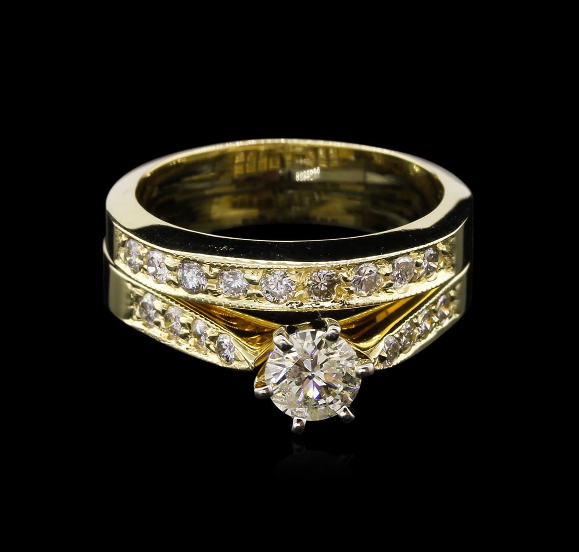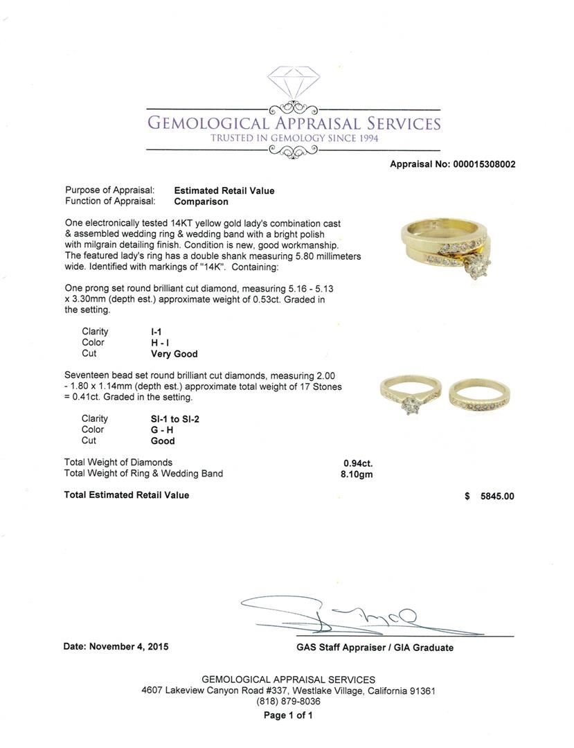 One electronically tested 14KT yellow gold lady's combination cast & assembled wedding ring & wedding band with a bright polish with milgrain detailing finish. The featured lady's ring has a double shank measuring 5.80 millimeters wide. Identified with markings of "14K". Condition is new, good workmanship. Containing: One prong set round brilliant cut diamond, measuring 5.16 - 5.13 x 3.30mm (depth est.) approximate weight of 0.53ct. Graded in the setting. Clarity: I-1. Color: H - I. Cut Very Good Seventeen bead set round brilliant cut diamonds, measuring 2.00 - 1.80 x 1.14mm (depth est.) approximate total weight of 17 Stones = 0.41ct. Graded in the setting. Clarity: SI-1 to SI-2. Color: G - Good. Total Weight of Diamonds 0.94ct. Total Weight of Ring & Wedding Band 8.10gm GAS Appraised at $5,845.00.