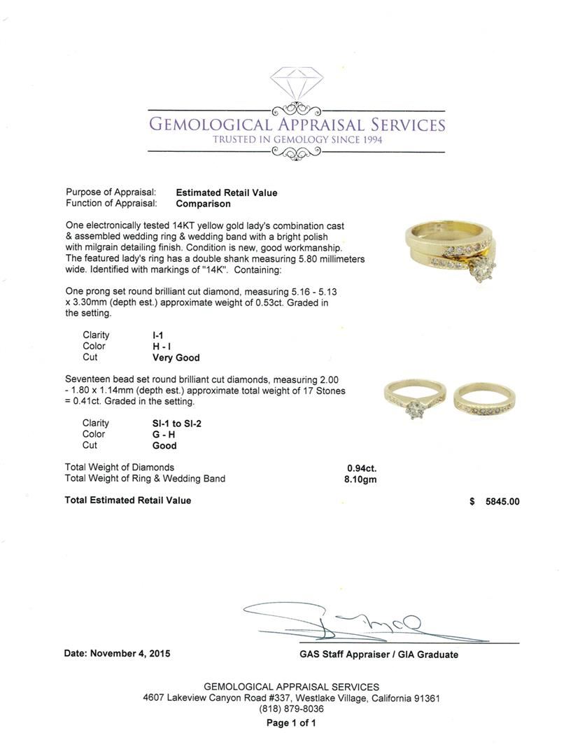 One electronically tested 14KT yellow gold lady's combination cast & assembled wedding ring & wedding band with a bright polish with milgrain detailing finish. The featured lady's ring has a double shank measuring 5.80 millimeters wide. Identified with markings of "14K". Condition is new, good workmanship. Containing: One prong set round brilliant cut diamond, measuring 5.16 - 5.13 x 3.30mm (depth est.) approximate weight of 0.53ct. Graded in the setting. Clarity: I-1. Color: H - I. Cut Very Good Seventeen bead set round brilliant cut diamonds, measuring 2.00 - 1.80 x 1.14mm (depth est.) approximate total weight of 17 Stones = 0.41ct. Graded in the setting. Clarity: SI-1 to SI-2. Color: G - Good. Total Weight of Diamonds 0.94ct. Total Weight of Ring & Wedding Band 8.10gm GAS Appraised at $5,845.00.