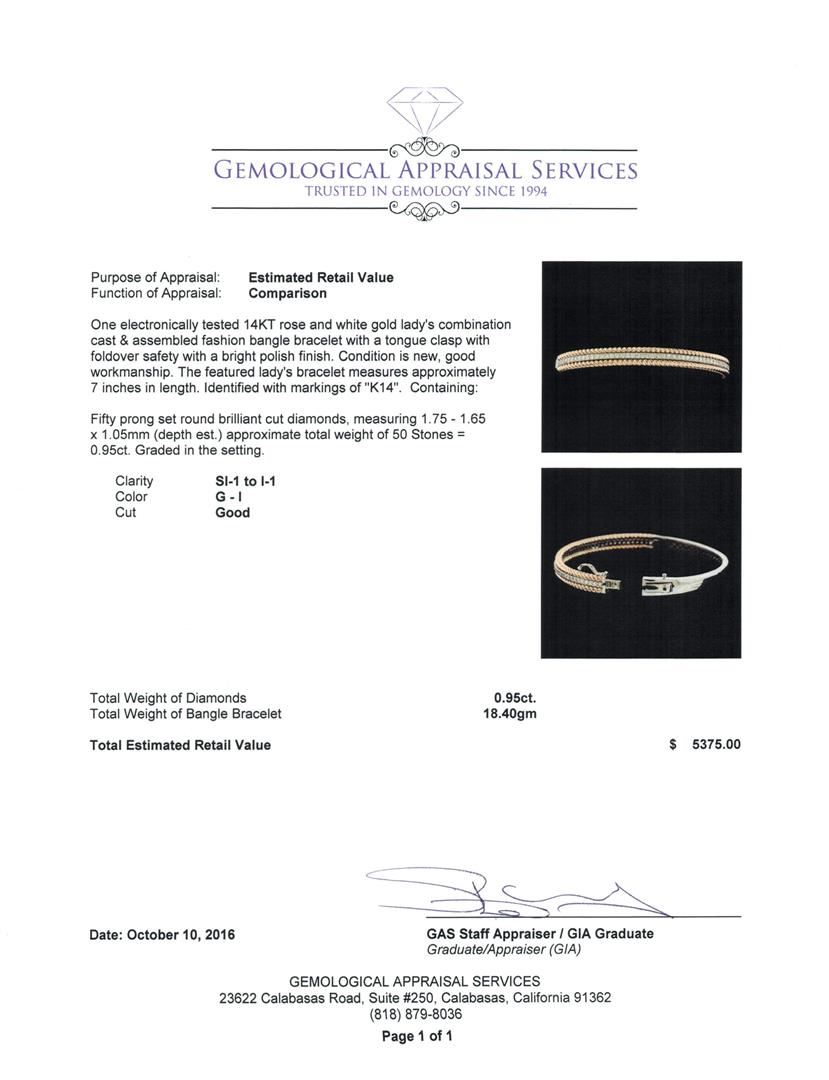 One electronically tested 14KT rose and white gold lady's combination cast & assembled fashion bangle bracelet with a tongue clasp with foldover safety with a bright polish finish. The featured lady's bracelet measures approximately 7 inches in length. Identified with markings of 'K14'. Condition is new, good workmanship. Containing: Fifty prong set round brilliant cut diamonds, measuring 1.75 - 1.65 x 1.05mm (depth est.) approximate total weight of 50 Stones = 0.95ct. Graded in the setting. Clarity SI-1 to I-1. Color: G - I Cut Good. Total Weight of Diamonds 0.95ct.. Total Weight of Bangle Bracelet 18.40gm. GAS Appraised at $5,375.00.