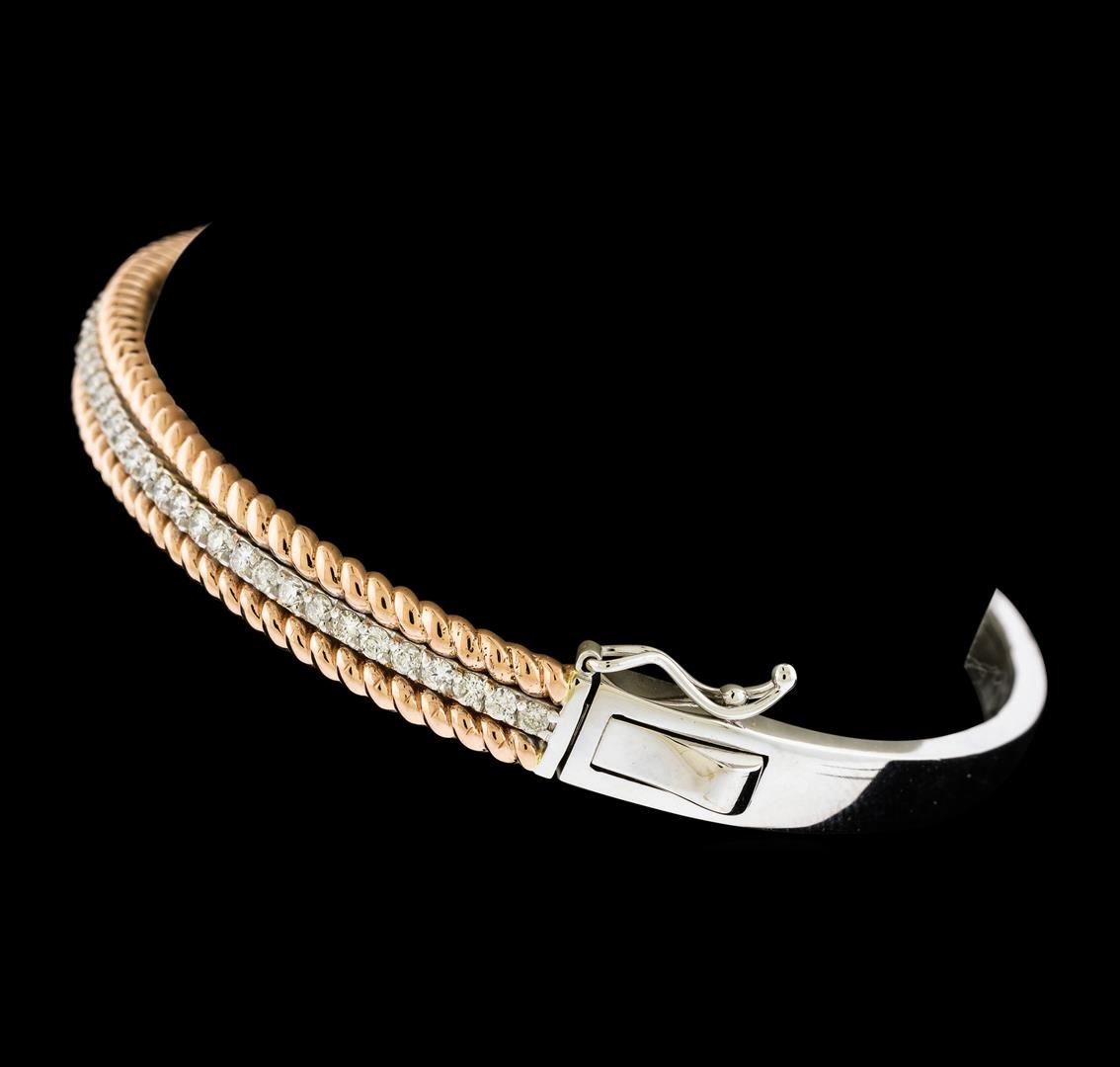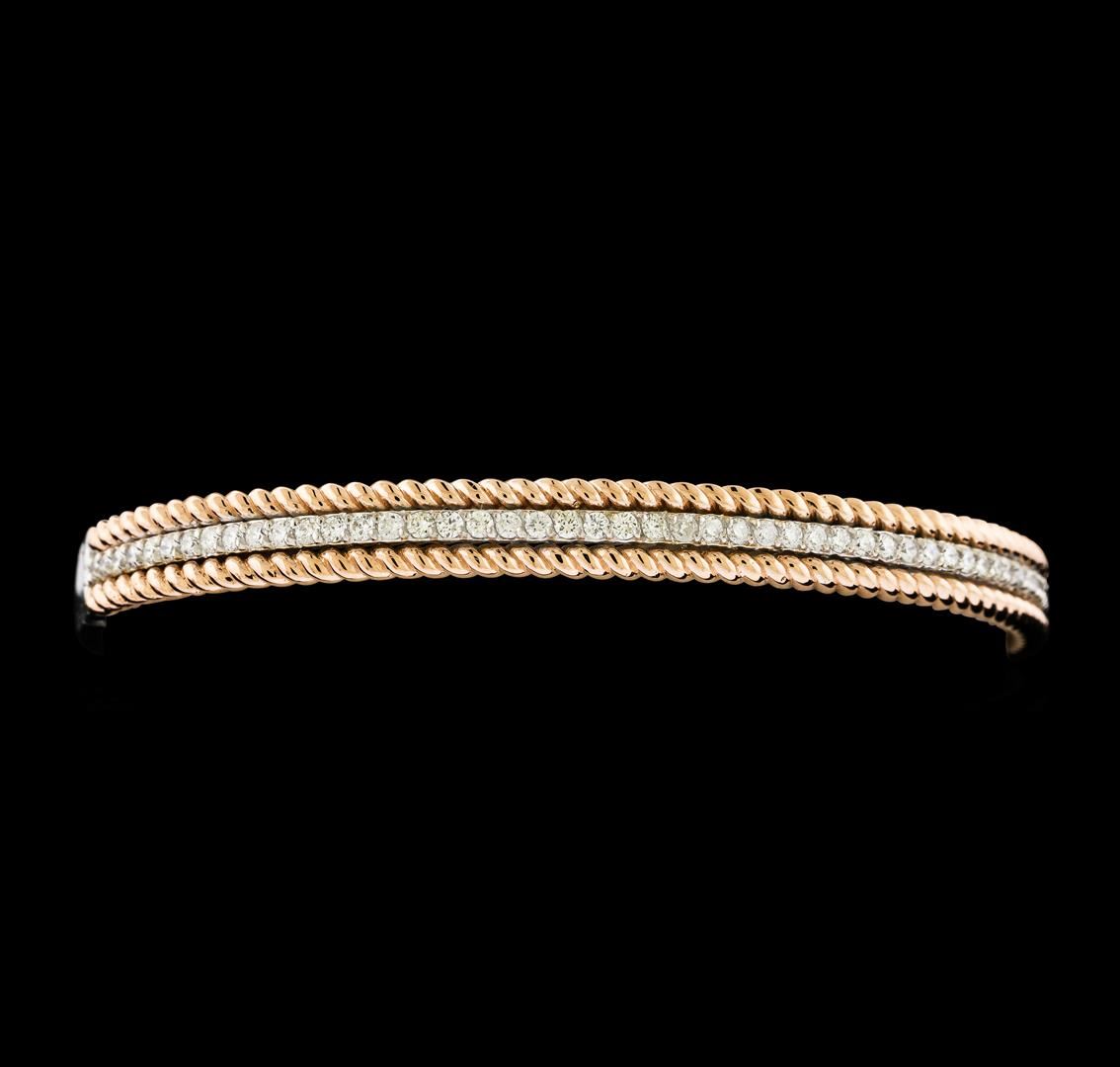 One electronically tested 14KT rose and white gold lady's combination cast & assembled fashion bangle bracelet with a tongue clasp with foldover safety with a bright polish finish. The featured lady's bracelet measures approximately 7 inches in length. Identified with markings of 'K14'. Condition is new, good workmanship. Containing: Fifty prong set round brilliant cut diamonds, measuring 1.75 - 1.65 x 1.05mm (depth est.) approximate total weight of 50 Stones = 0.95ct. Graded in the setting. Clarity SI-1 to I-1. Color: G - I Cut Good. Total Weight of Diamonds 0.95ct.. Total Weight of Bangle Bracelet 18.40gm. GAS Appraised at $5,375.00.
