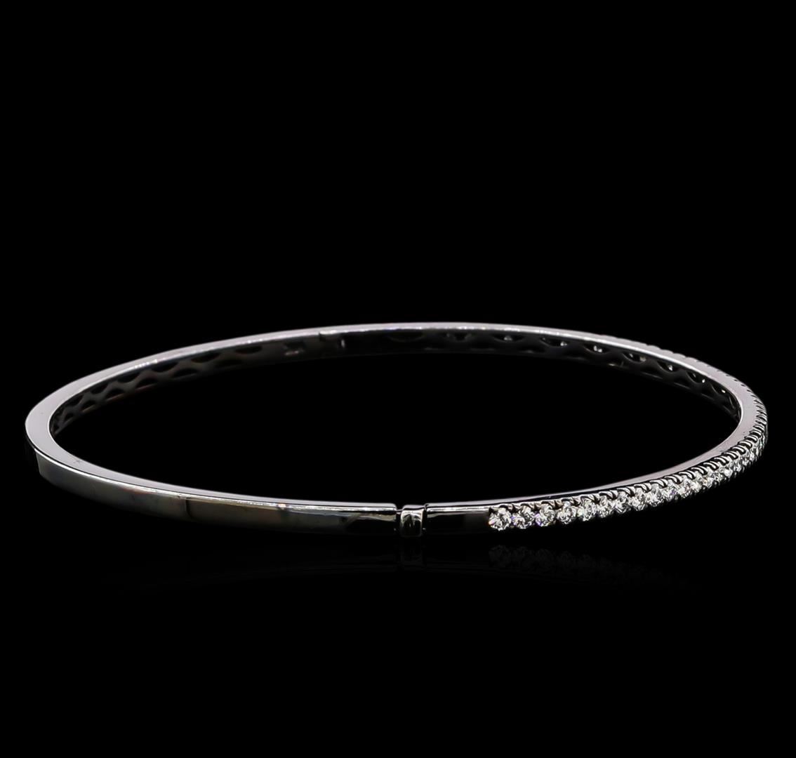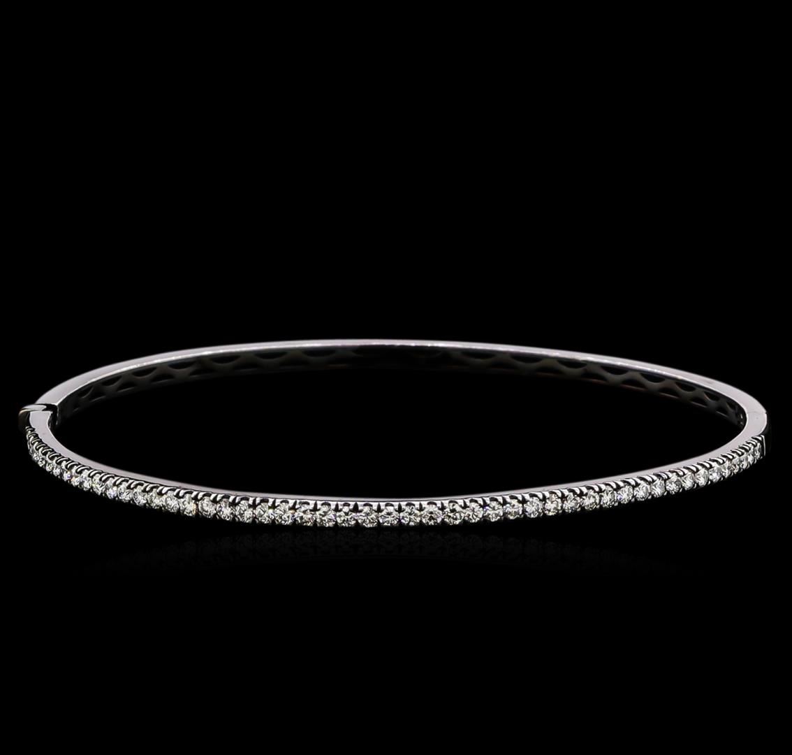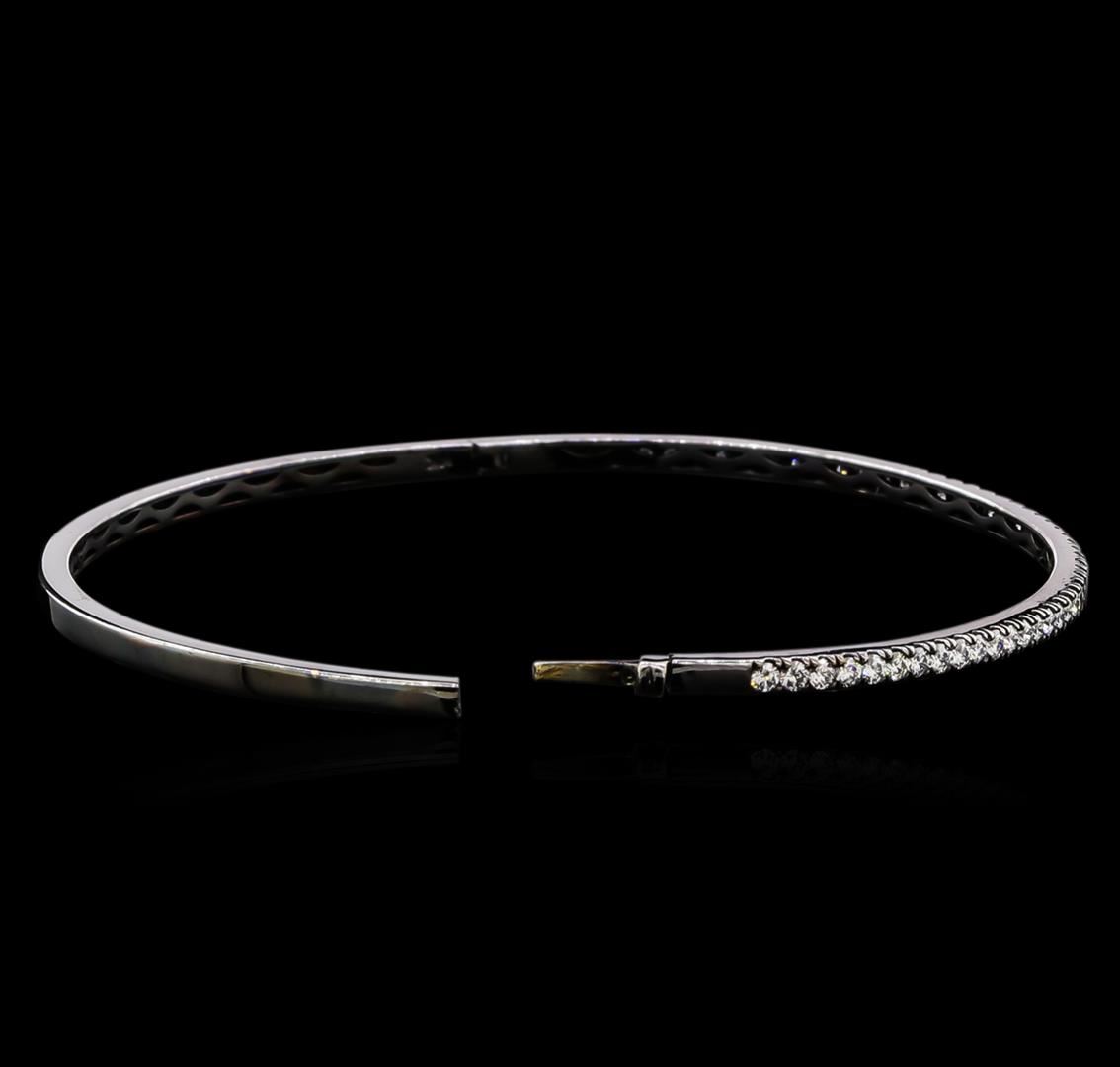 One electronically tested 14KT white gold ladies cast & assembled diamond bangle bracelet. Six and one-half inch wearable length and two millimeter width diamond ribbon bracelet supported by a hinged shoulder, terminating in a concealed snap locking clasp. Anodized finish. Identified with markings of "14K". Condition is good. Containing: Forty-Eight prong set round brilliant cut diamonds, measuring 1.70 x 1.02mm (depth est.) approximate total weight of 48 Stones = 0.95ct. Graded in the setting. Clarity: VVS-1 to VS-1. Color: F - H. Total Weight of Diamonds 0.95ct. Total Weight of Bracelet 6.00gm. AIG Appraised at $4,810.00.
