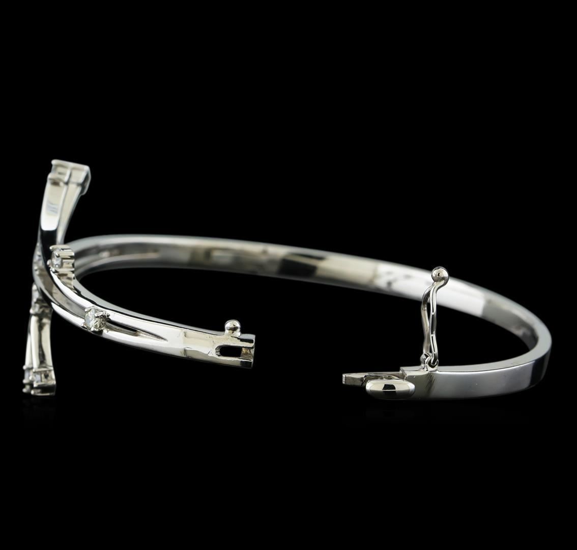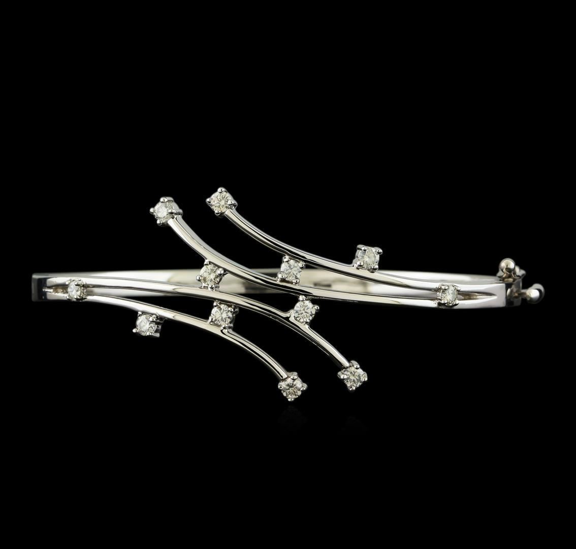One electronically tested 14KT white gold lady's combination cast & assembled fashion bangle bracelet with a tongue clasp with foldover safety with a bright polish finish. The featured lady's bracelet measures approximately 7 inches in circumference. Identified with markings of "14K". Condition is new, good workmanship. Containing: Twelve prong set round brilliant cut diamonds, measuring 2.80 - 2.70 x 1.71mm (depth est.) approximate total weight of 12 Stones = 0.95ct. Graded in the setting. Clarity: SI-1 to SI-2. Color: H - I. Cut Very Good. Total Weight of Diamonds 0.95ct. Total Weight of Bangle Bracelet 17.50gm. GAS Appraised.