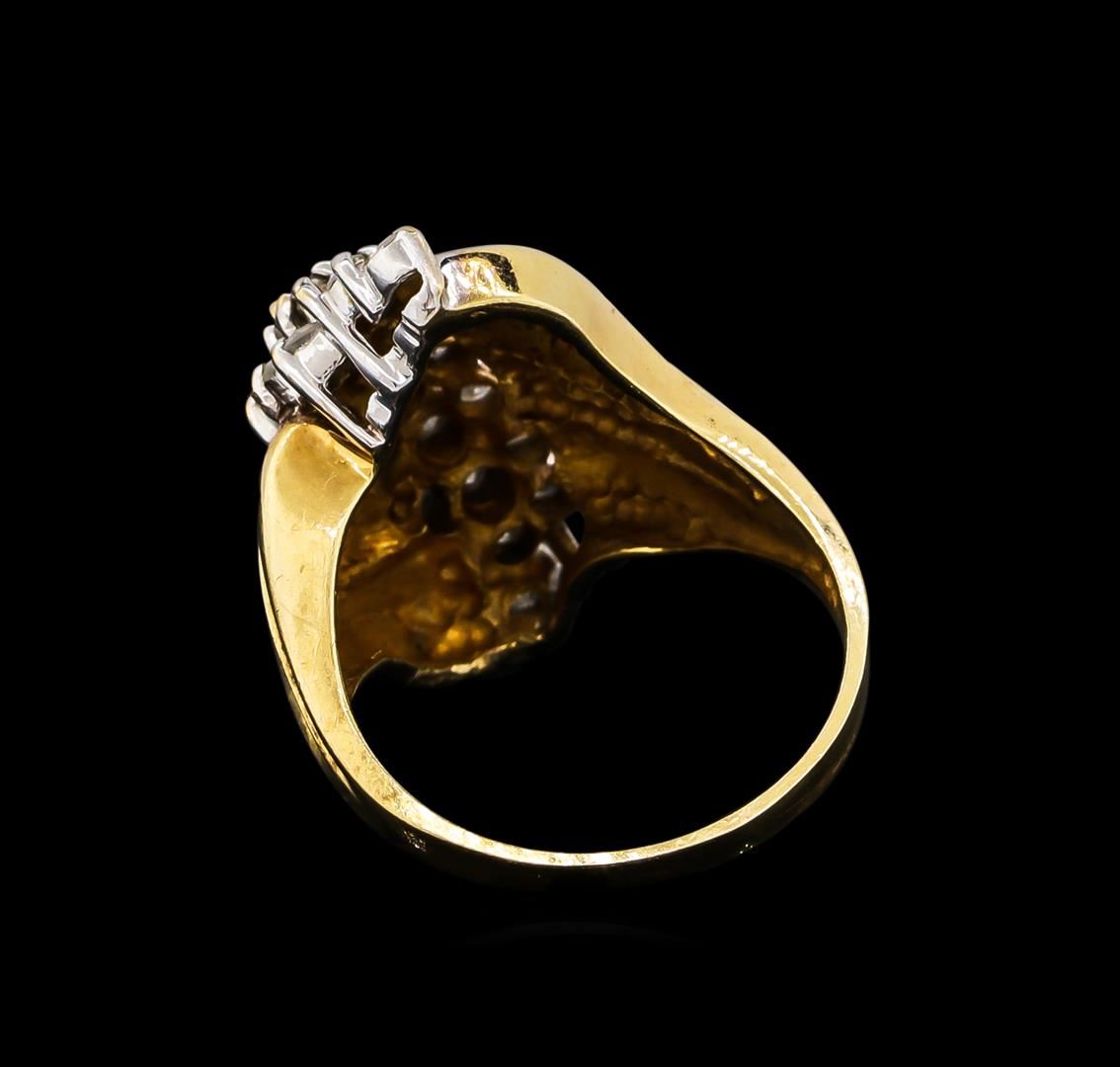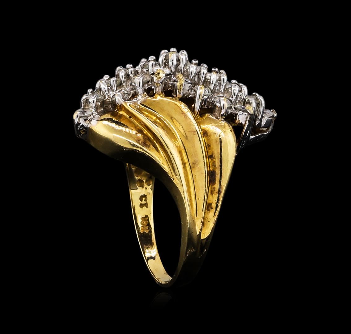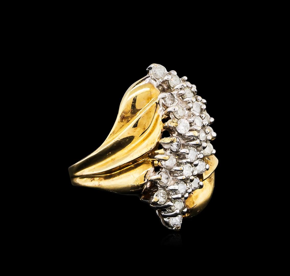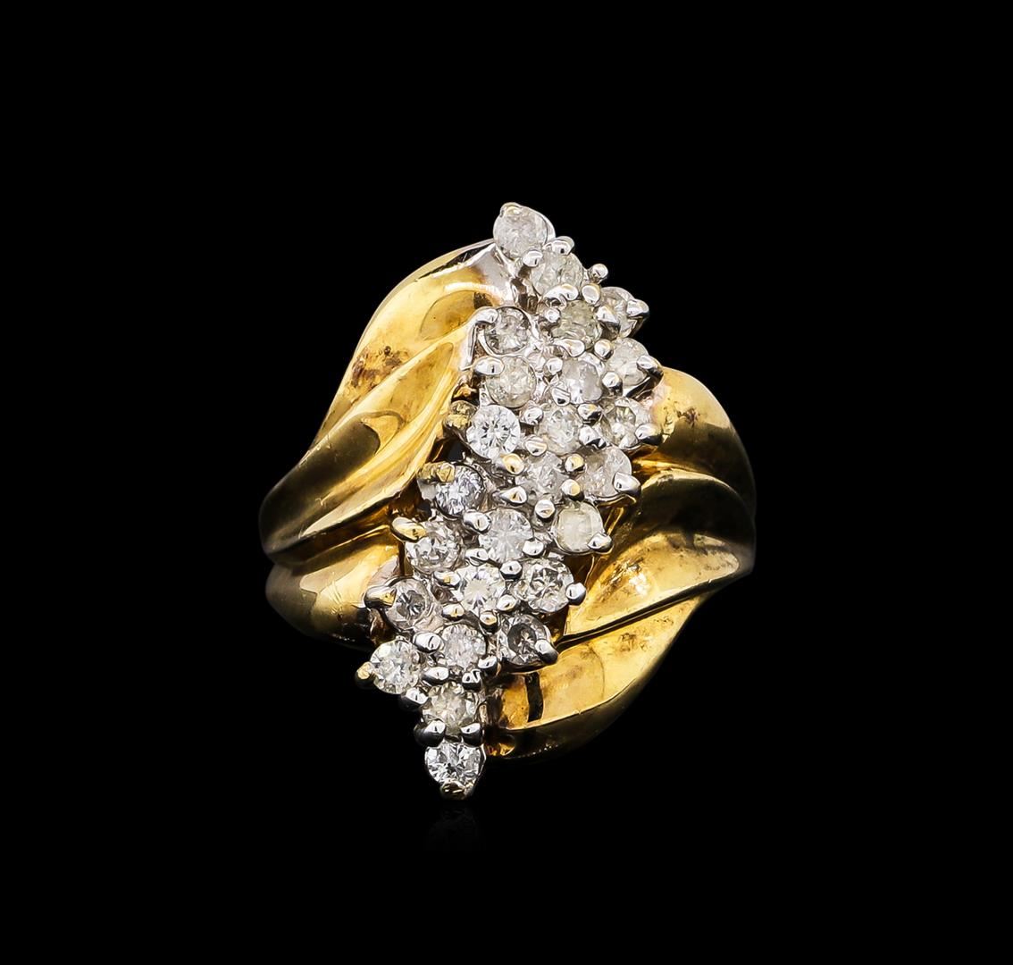 One electronically tested 10KT yellow gold ladies cast diamond ring. The ring features a cascading diamond cluster supported by scalloped shoulders, completed by a two millimeter wide band. Bright polish finish with rhodium accents. Identified with markings of "10K". Condition is good. Containing: Twenty-Five prong set round brilliant cut diamonds, measuring 2.20 - 2.00 x 1.26mm (depth est.) approximate total weight of 25 Stones = 0.95ct. Graded in the setting. Clarity: I-2 to I-3. Color: I - K. Total Weight of Diamonds 0.95ct. Total Weight of Ring 6.45 grams. AIG Appraised.