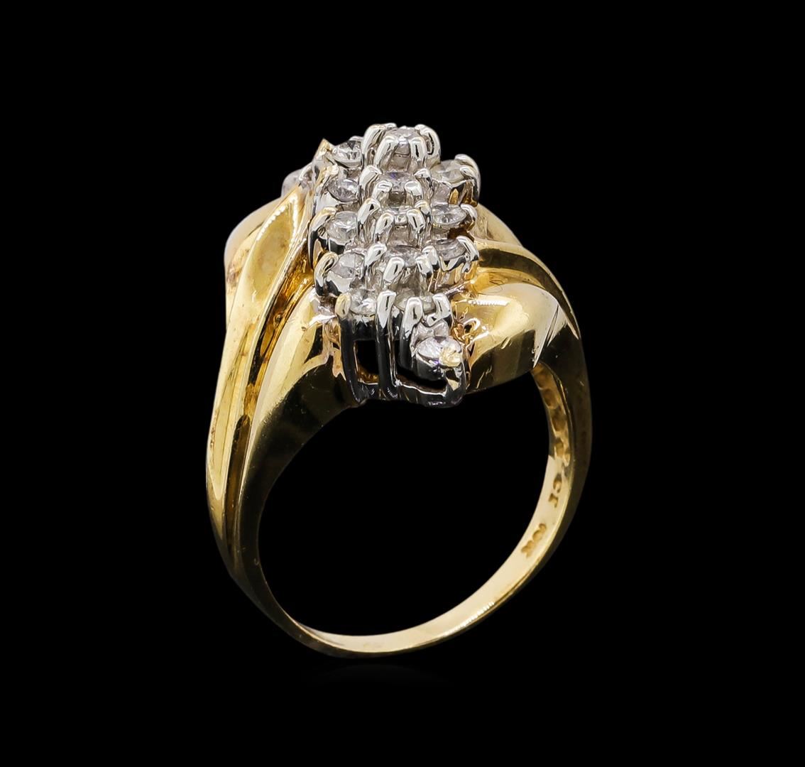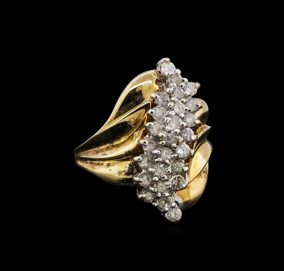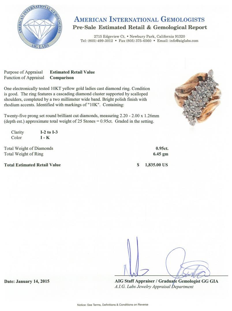 One electronically tested 10KT yellow gold ladies cast diamond ring. The ring features a cascading diamond cluster supported by scalloped shoulders, completed by a two millimeter wide band. Bright polish finish with rhodium accents. Identified with markings of "10K". Condition is good. Containing: Twenty-Five prong set round brilliant cut diamonds, measuring 2.20 - 2.00 x 1.26mm (depth est.) approximate total weight of 25 Stones = 0.95ct. Graded in the setting. Clarity: I-2 to I-3. Color: I - K. Total Weight of Diamonds 0.95ct. Total Weight of Ring 6.45 grams. AIG Appraised.