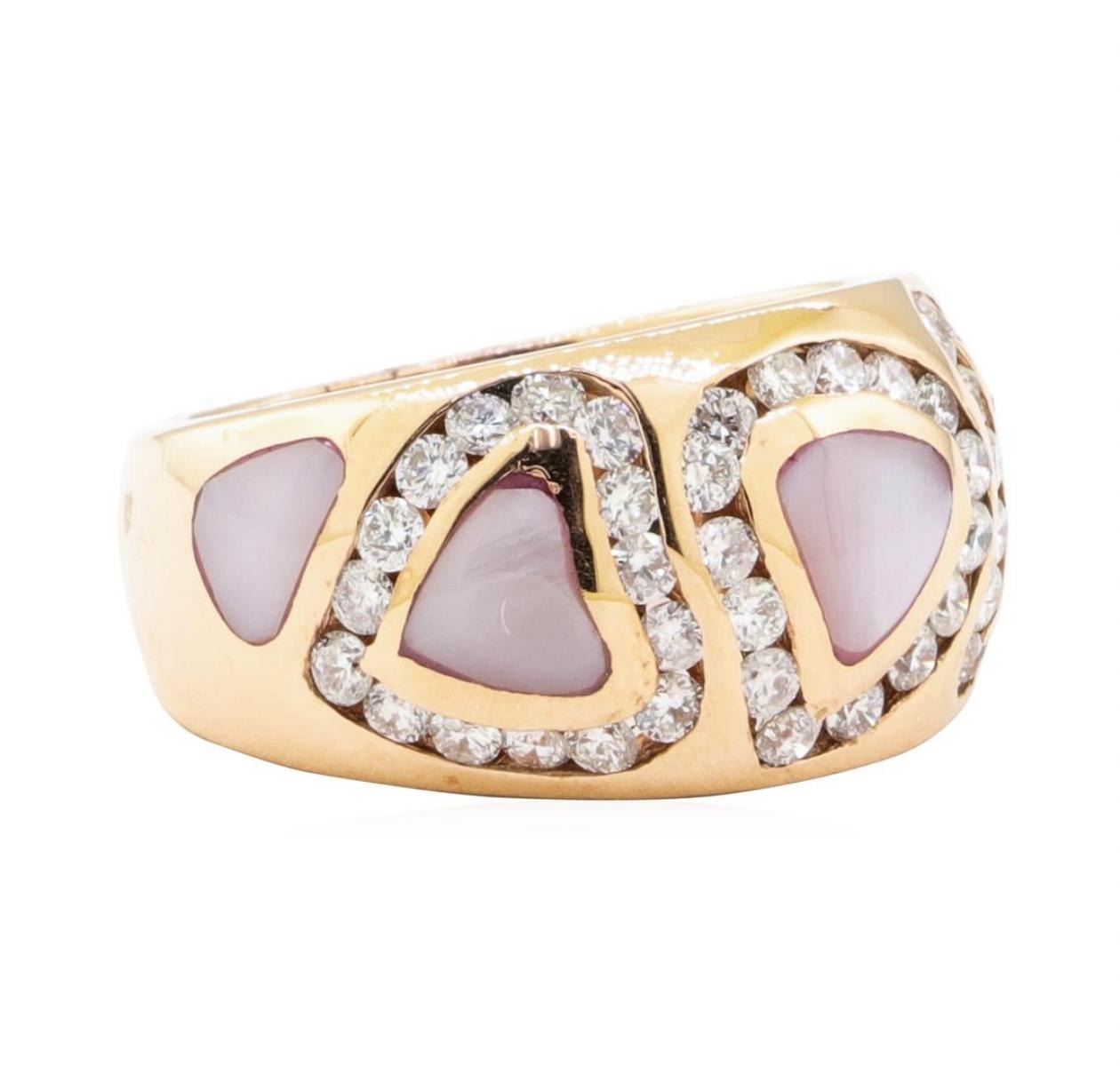 One electronically tested 14KT rose gold lady's cast fashion ring with a tapered wide band with dome with a bright polish finish. The featured lady's ring has five pieces of inlaid mother of pearl and a shank measuring 5.60 millimeters wide. Identified with markings of '14K'. Condition is new, good workmanship. Containing: Forty-Four channel set round brilliant cut diamonds, measuring 1.85 - 1.80 x 1.10mm (depth est.) approximate total weight of 44 Stones = 0.95ct. Graded in the setting. Color G - H Clarity SI-1 to SI-2 Cut Very Good. Total Weight of Diamonds 0.95ct.. Total Weight of Ring 9.00gm GAS Appraised at $4130.00. GAS Appraised.