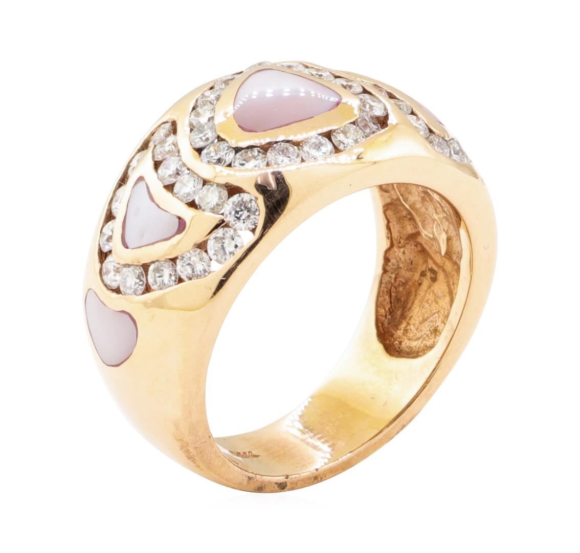 One electronically tested 14KT rose gold lady's cast fashion ring with a tapered wide band with dome with a bright polish finish. The featured lady's ring has five pieces of inlaid mother of pearl and a shank measuring 5.60 millimeters wide. Identified with markings of '14K'. Condition is new, good workmanship. Containing: Forty-Four channel set round brilliant cut diamonds, measuring 1.85 - 1.80 x 1.10mm (depth est.) approximate total weight of 44 Stones = 0.95ct. Graded in the setting. Color G - H Clarity SI-1 to SI-2 Cut Very Good. Total Weight of Diamonds 0.95ct.. Total Weight of Ring 9.00gm GAS Appraised at $4130.00. GAS Appraised.