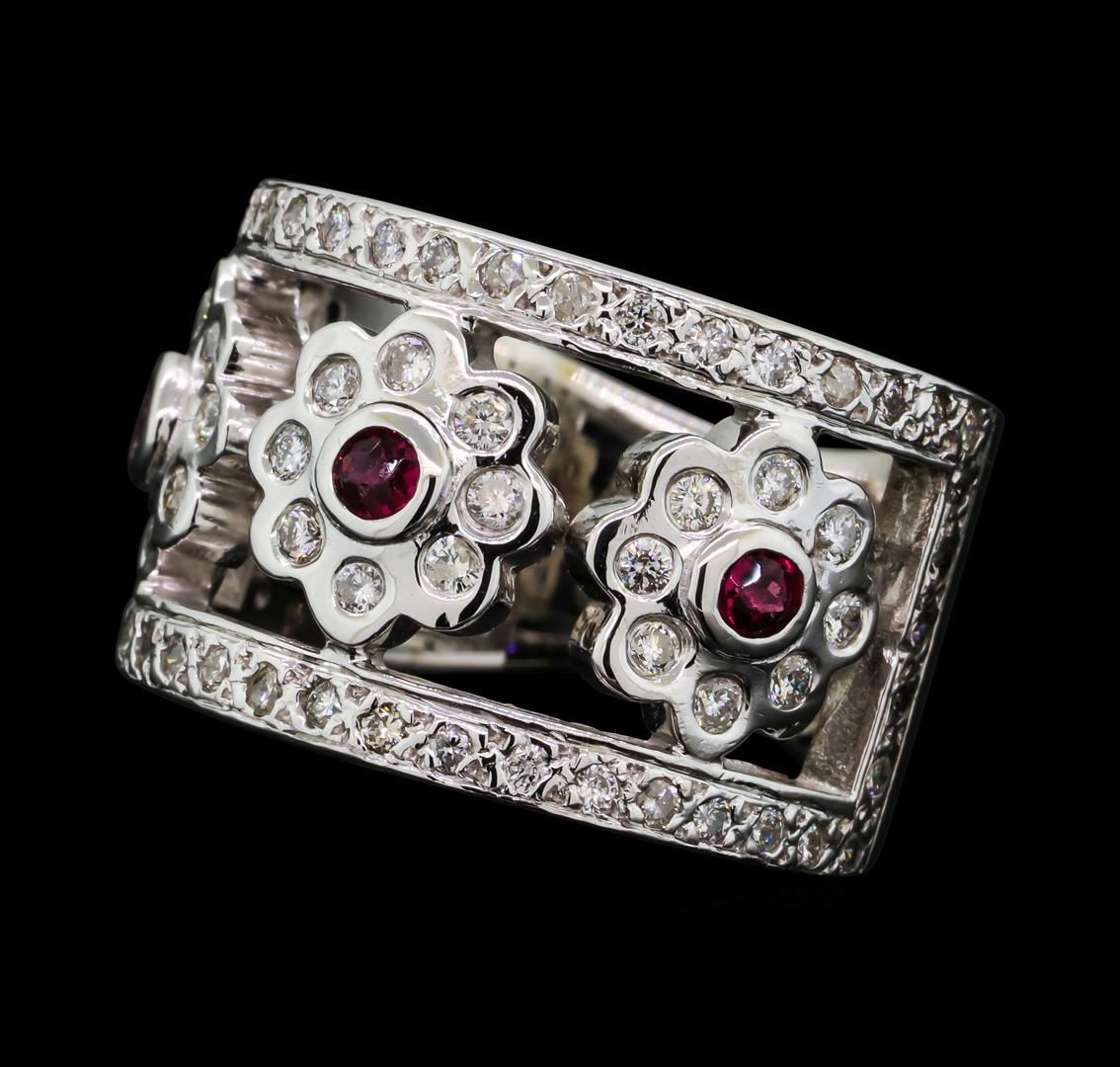One electronically tested 14KT white gold lady's combination cast & assembled fashion floral design band with a bright polish finish. The featured lady's band has a wide band motif containing three flower motifs surrounded by a diamond frame. The band measures 7.70 millimeters wide. Identified with markings of '14K'. Condition is like new, good workmanship. Containing: Three bezel set round modified brilliant cut natural rubies, measuring 2.90 - 2.80 x 1.50 mm, (depth est.) approximate total weight of 0.28ct., clarity is slightly included, medium dark, moderately strong, slightly purplish red color, (GIA slpR 6/4), cut is good. The featured rubies has surface abrasion on the table and crown. Transmitting light with a minimum of distortion, transparent. Colored gemstones are presumed to have been subjected to commonly used enhancement processes. Graded in the setting. Twenty-Four bezel set round brilliant cut diamonds, measuring 1.80 - 1.75 x 1.10mm (depth est.) approximate total weight of 24 Stones = 0.50ct. Graded in the setting. Clarity SI-1 to I-1. Color: H - I Cut Good Forty-Eight prong set round brilliant cut diamonds, measuring 1.40 - 1.30 x 0.84mm (depth est.) approximate total weight of 48 Stones = 0.45ct. Graded in the setting. Clarity SI-2 to I-2. Color: H - I Cut Good. Total Weight of Colored Stones 0.28ct.. Total Weight of Diamonds 0.95ct.. Total Weight of Band 14.00gm GAS Appraised at $4,860.00.