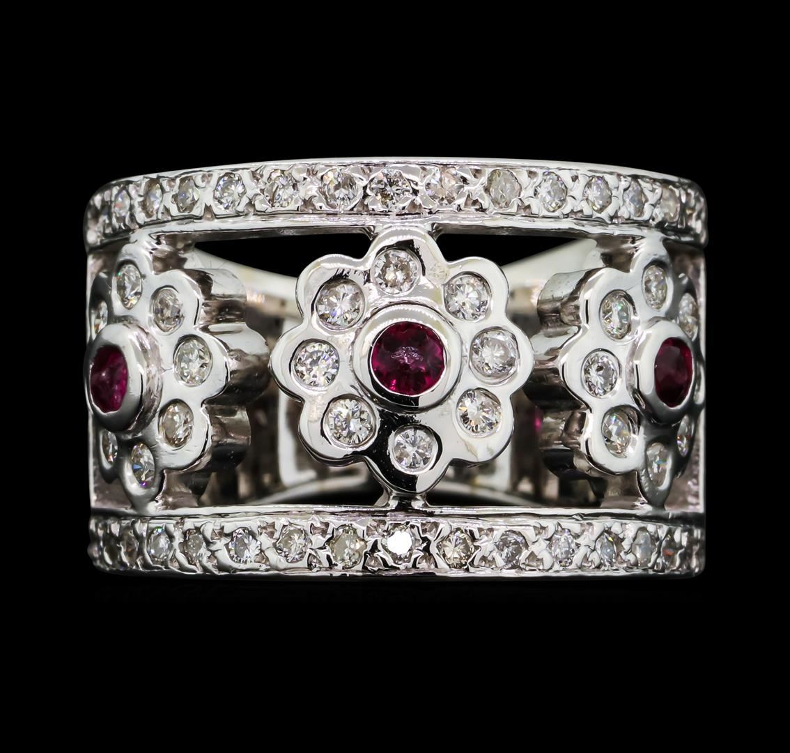 One electronically tested 14KT white gold lady's combination cast & assembled fashion floral design band with a bright polish finish. The featured lady's band has a wide band motif containing three flower motifs surrounded by a diamond frame. The band measures 7.70 millimeters wide. Identified with markings of '14K'. Condition is like new, good workmanship. Containing: Three bezel set round modified brilliant cut natural rubies, measuring 2.90 - 2.80 x 1.50 mm, (depth est.) approximate total weight of 0.28ct., clarity is slightly included, medium dark, moderately strong, slightly purplish red color, (GIA slpR 6/4), cut is good. The featured rubies has surface abrasion on the table and crown. Transmitting light with a minimum of distortion, transparent. Colored gemstones are presumed to have been subjected to commonly used enhancement processes. Graded in the setting. Twenty-Four bezel set round brilliant cut diamonds, measuring 1.80 - 1.75 x 1.10mm (depth est.) approximate total weight of 24 Stones = 0.50ct. Graded in the setting. Clarity SI-1 to I-1. Color: H - I Cut Good Forty-Eight prong set round brilliant cut diamonds, measuring 1.40 - 1.30 x 0.84mm (depth est.) approximate total weight of 48 Stones = 0.45ct. Graded in the setting. Clarity SI-2 to I-2. Color: H - I Cut Good. Total Weight of Colored Stones 0.28ct.. Total Weight of Diamonds 0.95ct.. Total Weight of Band 14.00gm GAS Appraised at $4,860.00.