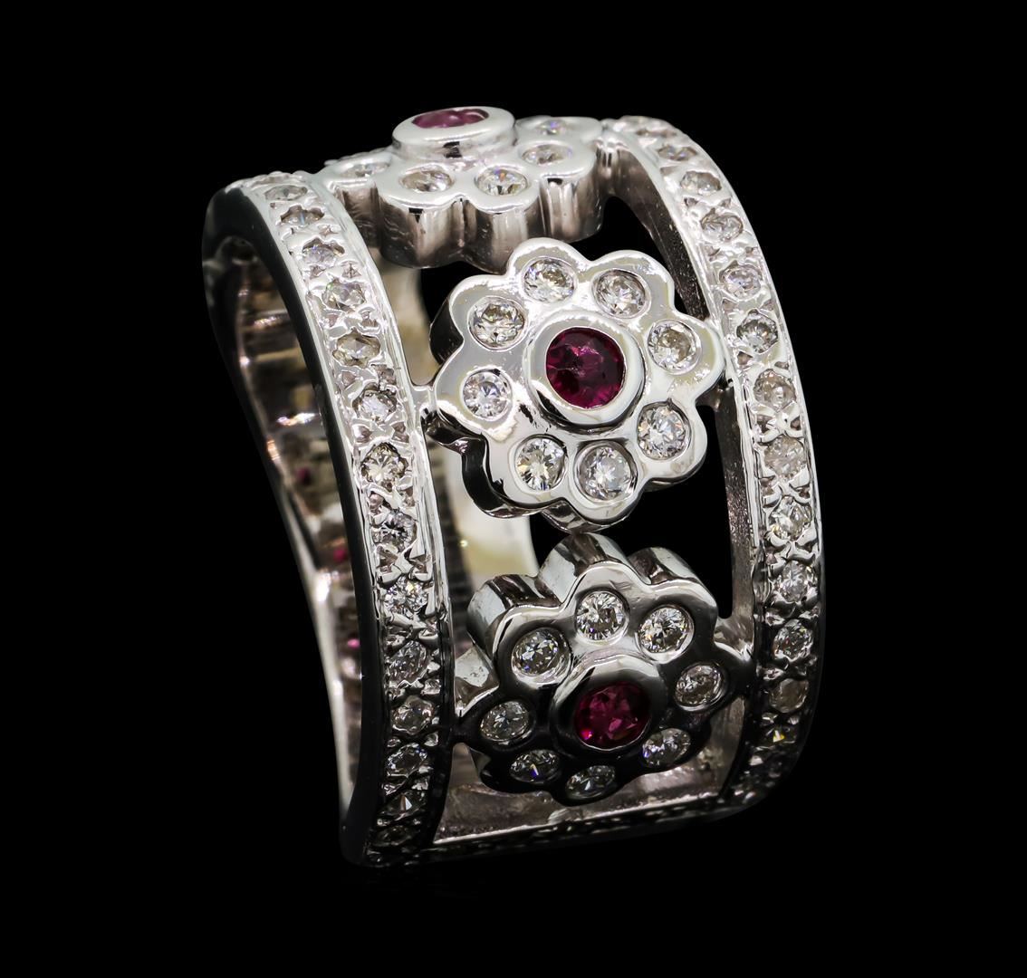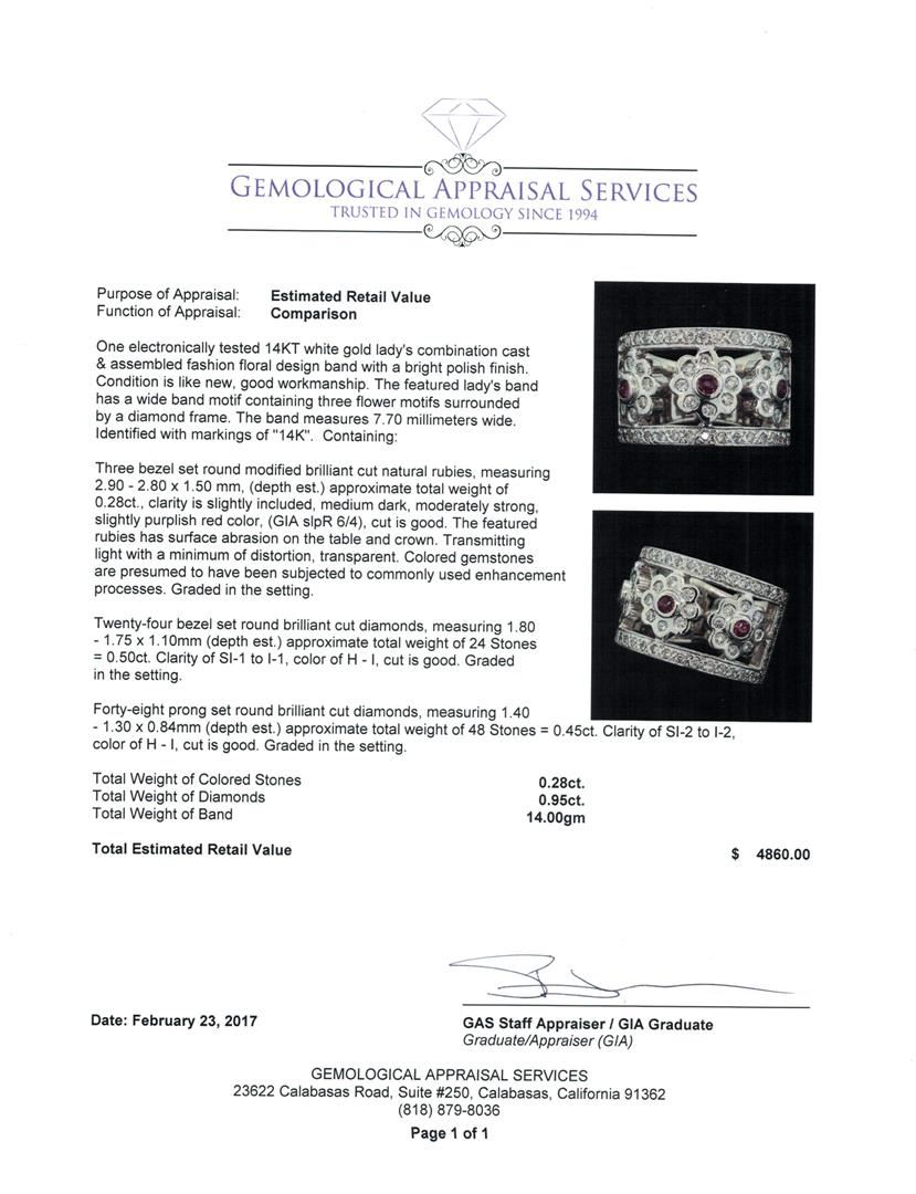 One electronically tested 14KT white gold lady's combination cast & assembled fashion floral design band with a bright polish finish. The featured lady's band has a wide band motif containing three flower motifs surrounded by a diamond frame. The band measures 7.70 millimeters wide. Identified with markings of '14K'. Condition is like new, good workmanship. Containing: Three bezel set round modified brilliant cut natural rubies, measuring 2.90 - 2.80 x 1.50 mm, (depth est.) approximate total weight of 0.28ct., clarity is slightly included, medium dark, moderately strong, slightly purplish red color, (GIA slpR 6/4), cut is good. The featured rubies has surface abrasion on the table and crown. Transmitting light with a minimum of distortion, transparent. Colored gemstones are presumed to have been subjected to commonly used enhancement processes. Graded in the setting. Twenty-Four bezel set round brilliant cut diamonds, measuring 1.80 - 1.75 x 1.10mm (depth est.) approximate total weight of 24 Stones = 0.50ct. Graded in the setting. Clarity SI-1 to I-1. Color: H - I Cut Good Forty-Eight prong set round brilliant cut diamonds, measuring 1.40 - 1.30 x 0.84mm (depth est.) approximate total weight of 48 Stones = 0.45ct. Graded in the setting. Clarity SI-2 to I-2. Color: H - I Cut Good. Total Weight of Colored Stones 0.28ct.. Total Weight of Diamonds 0.95ct.. Total Weight of Band 14.00gm GAS Appraised at $4,860.00.