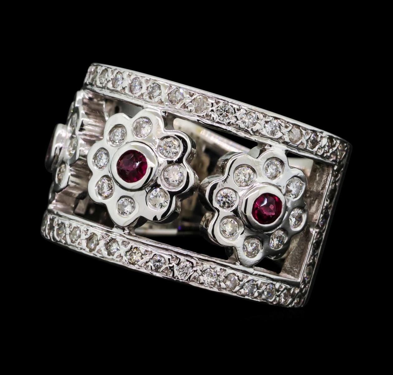 One electronically tested 14KT white gold lady's combination cast & assembled fashion floral design band with a bright polish finish. The featured lady's band has a wide band motif containing three flower motifs surrounded by a diamond frame. The band measures 7.70 millimeters wide. Identified with markings of '14K'. Condition is like new, good workmanship. Containing: Three bezel set round modified brilliant cut natural rubies, measuring 2.90 - 2.80 x 1.50 mm, (depth est.) approximate total weight of 0.28ct., clarity is slightly included, medium dark, moderately strong, slightly purplish red color, (GIA slpR 6/4), cut is good. The featured rubies has surface abrasion on the table and crown. Transmitting light with a minimum of distortion, transparent. Colored gemstones are presumed to have been subjected to commonly used enhancement processes. Graded in the setting. Twenty-Four bezel set round brilliant cut diamonds, measuring 1.80 - 1.75 x 1.10mm (depth est.) approximate total weight of 24 Stones = 0.50ct. Graded in the setting. Clarity SI-1 to I-1. Color: H - I Cut Good Forty-Eight prong set round brilliant cut diamonds, measuring 1.40 - 1.30 x 0.84mm (depth est.) approximate total weight of 48 Stones = 0.45ct. Graded in the setting. Clarity SI-2 to I-2. Color: H - I Cut Good. Total Weight of Colored Stones 0.28ct.. Total Weight of Diamonds 0.95ct.. Total Weight of Band 14.00gm GAS Appraised.