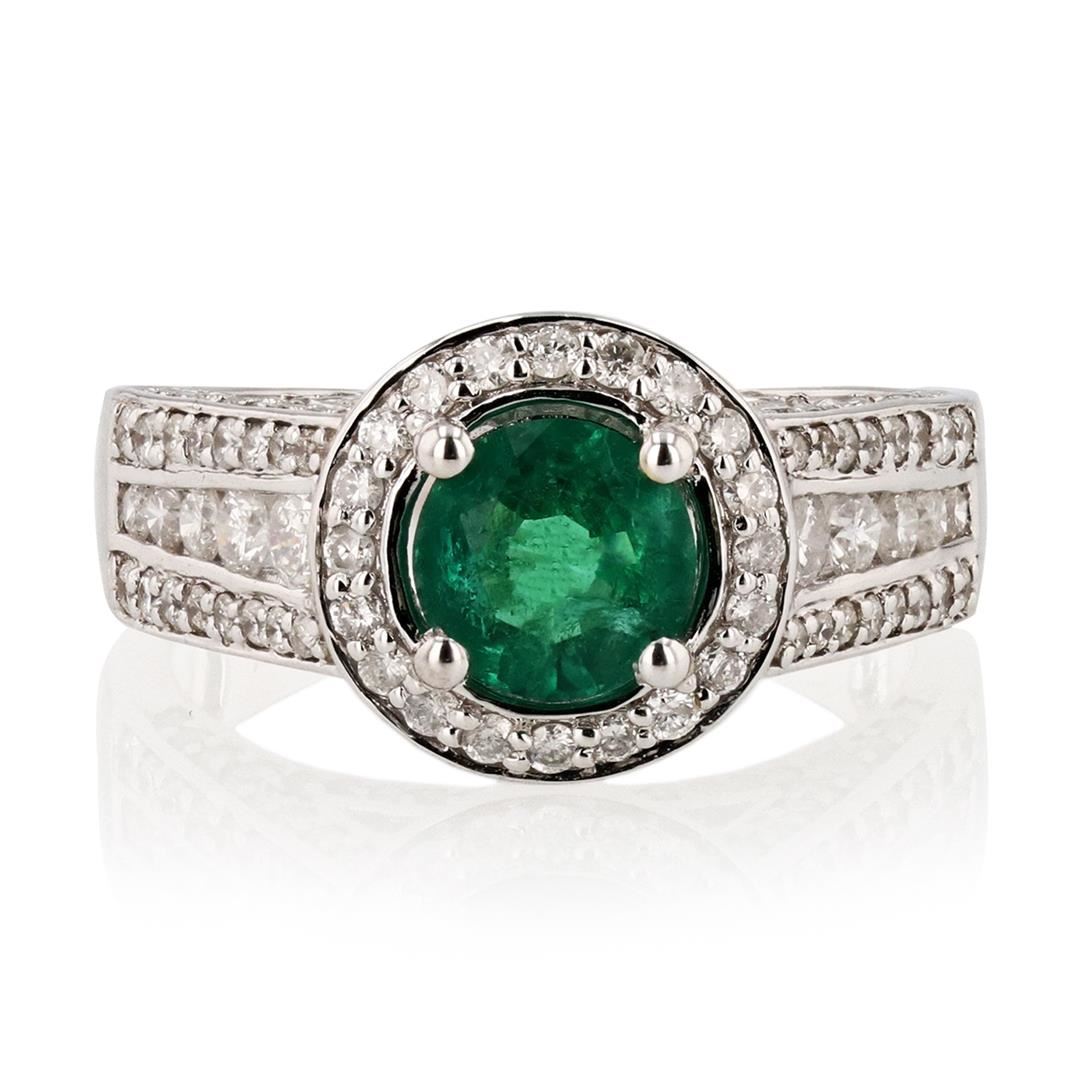 14K Gold Emerald & Diamond Ring One polished, stamped, and tested 14K white gold ring with a bright finish. The ring is mounted with: 1 genuine emerald center stone weighing approximately 0.95 carat, and 110 genuine round diamonds weighing approximately 1.13 carats. This item weighs 6.3 grams, condition is new, excellent workmanship. MAIN GEMSTONE Species: Natural Beryl Variety: Emerald Shape: Round Cutting Style: Brilliant Cut Crown Step Cut Pavilion Measurements: 6.5 mm Weight: 0.95 carat Color: Green Cut Grade: Very Good Refractive Index: 1.564 - 1.595 DR Birefringence: 0.005 to 0.009 Hardness: 7.5 - 8 ADJACENT GEMSTONES ON RING Identity: Natural Diamond Shape: Round Cutting Style: Brilliant Cut Quantity: 110 Diamonds Measurements: 0.9 - 2.5 mm Total Weight: 1.13 carats Color Grade: G - I Clarity Grade: SI1 - I1 Refractive Index: 2.418 Hardness: 10 EMERALD WEIGHT: 0.95ct TOTAL DIAMOND WEIGHT: 1.13ctw WEIGHT OF ITEM: 6.3 grams GOLD CONTENT: 14K White Gold