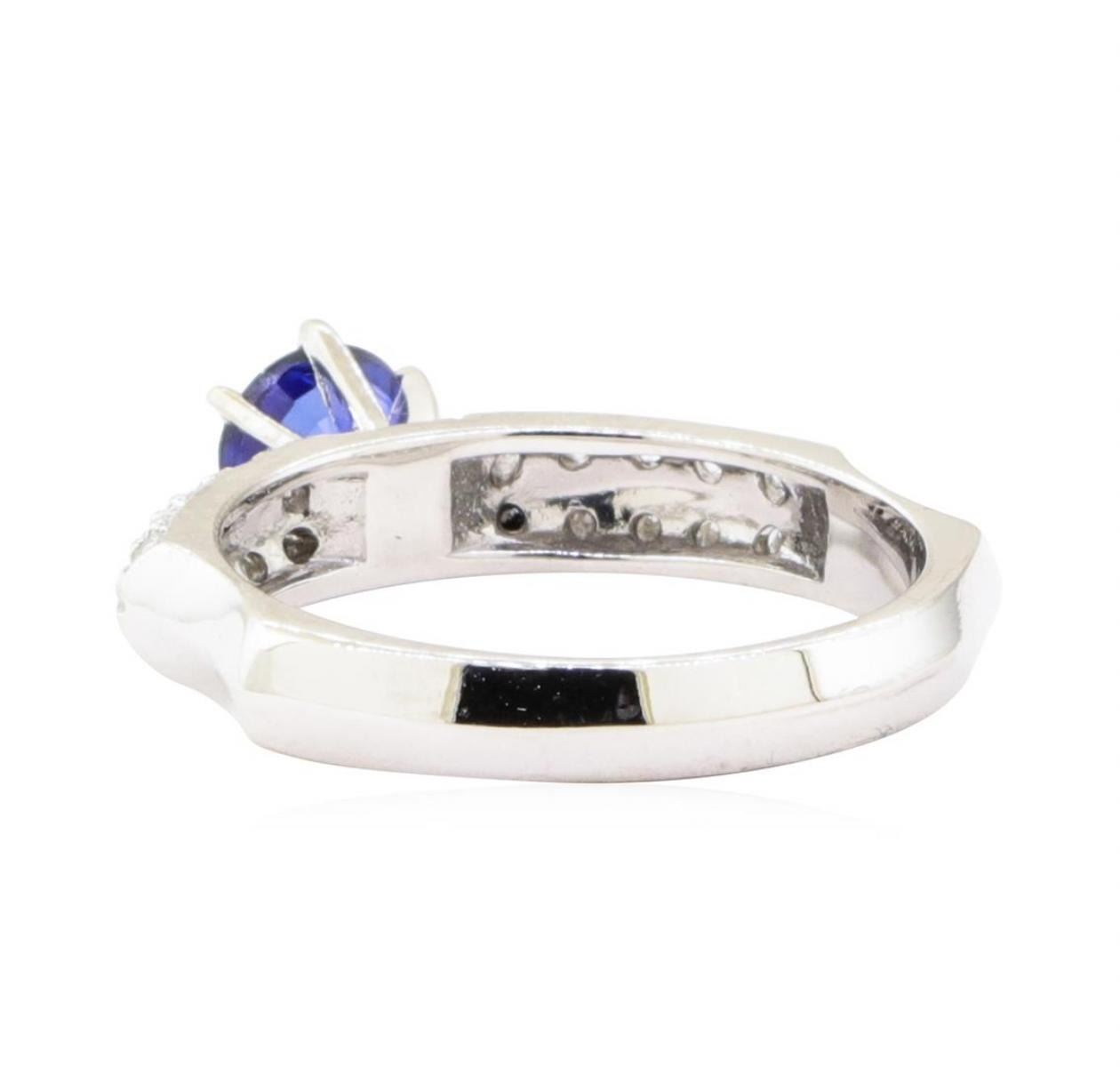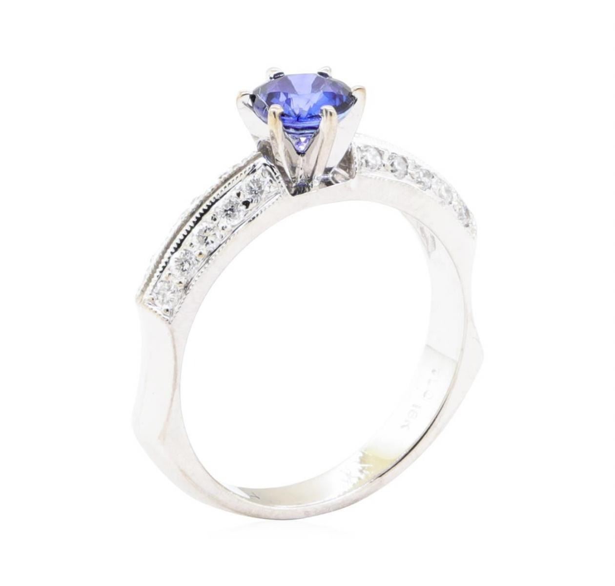 One electronically tested 18KT white gold lady's combination cast & assembled fashion ring with a straight line double row with a bright polish with milgrain detailing finish. The featured lady's ring has a knife edge shank measuring 3.20 millimeters wide. Identified with markings of '18K 750'. Condition is new, good workmanship. Containing: One prong set round modified mixed cut natural blue sapphire, measuring 5.40 - 5.37 x 2.70 mm, (depth est.) approximate weight of 0.65ct., clarity is slightly included, medium dark, strong, blue color, (GIA B 6/5), cut is very good. Transmitting light with a minimum of distortion, transparent. Colored gemstones are presumed to have been subjected to commonly used enhancement processes. Graded in the setting. Twenty prong set round brilliant cut diamonds, measuring 1.60 - 1.50 x 0.96mm (depth est.) approximate total weight of 20 Stones = 0.30 ct. Graded in the setting. Color G - I Clarity SI-1 to SI-2 Cut Good. Total Weight of Colored Stones 0.65ct.. Total Weight of Diamonds 0.30 ct.. Total Weight of Ring 4.40gm GAS Appraised at $2585.00. GAS Appraised.