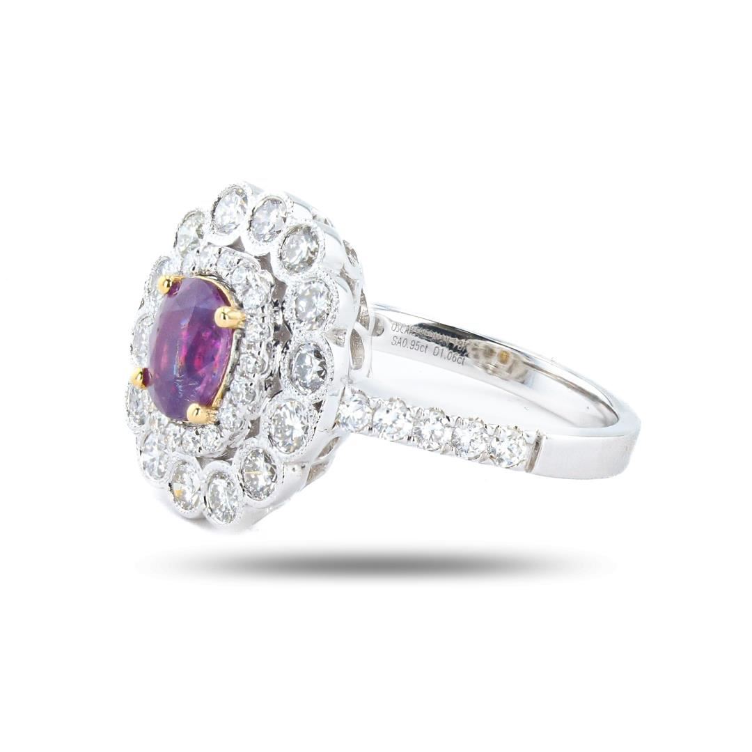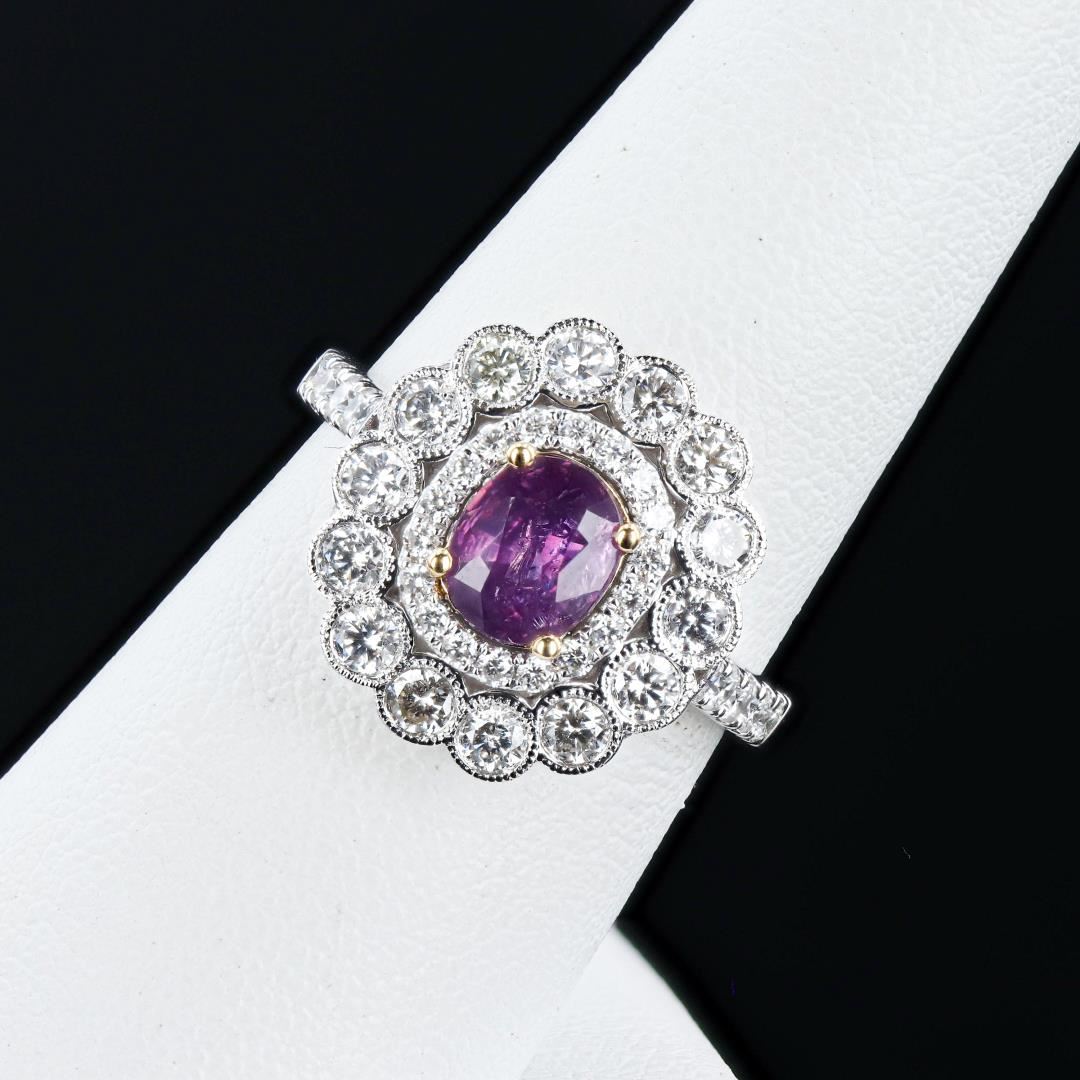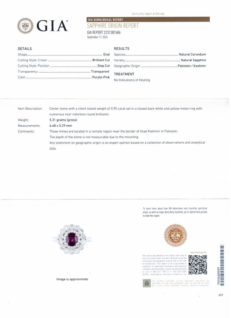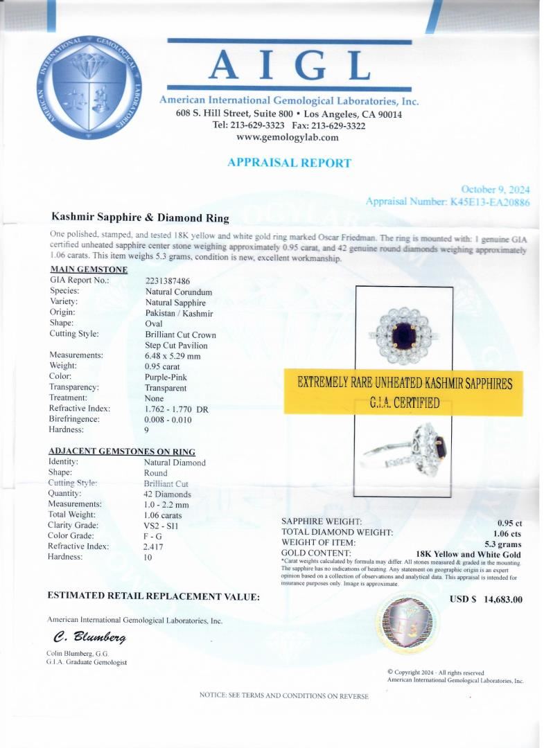 One polished, stamped, and tested 18K yellow and white gold ring marked Oscar Friedman. The ring is mounted with: 1 genuine GIA certified unheated sapphire center stone weighing approximately 0.95 carat, and 42 genuine round diamonds weighing approximately 1.06 carats. This item weighs 5.3 grams, condition is new, excellent workmanship. #MAIN GEMSTONE# GIA Report No.: 2231387486 Species: Natural Corundum Variety: Natural Sapphire Origin: Pakistan / Kashmir Shape: Oval Cutting Style: Brilliant Cut Crown, Step Cut Pavilion Measurements: 6.48 x 5.29mm Weight: 0.95 carat Color: Purple-Pink Transparency: Transparent Treatment: None Refractive Index: 1.762 - 1.770 DR Birefringence: 0.008 - 0.010 Hardness: 9 #ADJACENT GEMSTONES ON RING# Identity: Natural Diamond Shape: Round Cutting Style: Brilliant Cut Quantity: 42 Diamonds Measurements: 1.0 - 2.2mm Total Weight: 1.06 carats Clarity Grade: VS2-SI1 Color Grade: F-G Refractive Index: 2.417 Hardness: 10 SAPPHIRE WEIGHT: 0.95 ct TOTAL DIAMOND WEIGHT: 1.06 cts WEIGHT OF ITEM: 5.3 grams GOLD CONTENT: 18K Yellow and White Gold Size: 6 3/4
