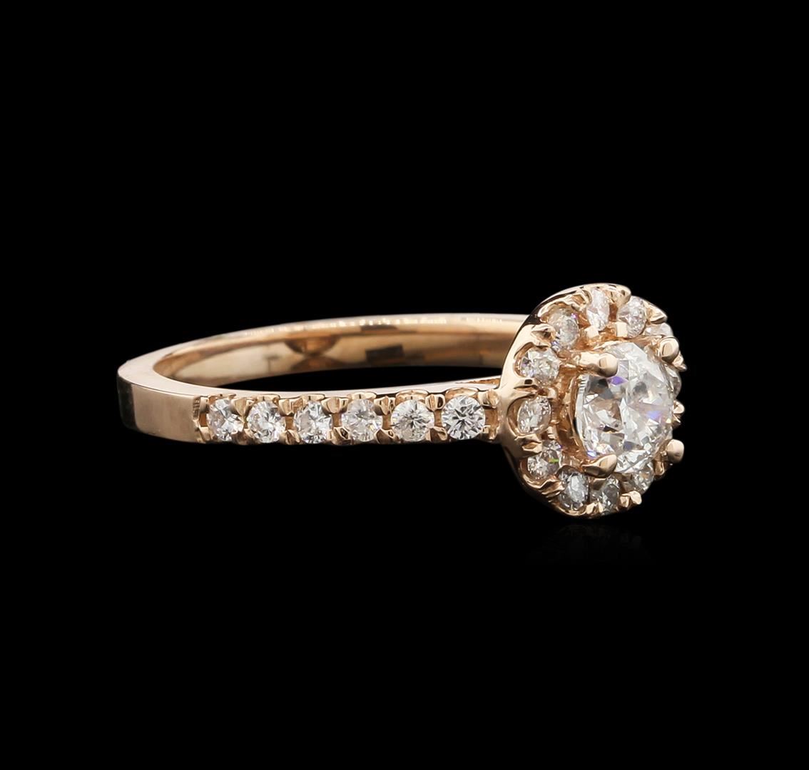 One electronically tested 14KT rose gold ladies cast diamond unity ring with a bright polish finish. The featured diamond is set within a diamond bezel supported by diamond set shoulders, completed by a one and one-half millimeter wide band. Identified with markings of "14K". Condition is new, good workmanship. Containing: One prong set round brilliant cut diamond, measuring 5.10 - 5.00 x 3.03mm approximate weight of 0.54ct with a faint blue fluorescence. Graded in the setting. Clarity: I-1. Color: H. Depth 60.0%. Table 53.5%. Twenty-Four prong set round brilliant cut diamonds approximate. Total Weight of 24 Stones = 0.41ct. Graded in the setting. Clarity: SI-2 to I-1. Color: G - I. Total Weight of Diamonds 0.95ct. Total Weight of Ring 3.15gm. AIG Appraised at $4,740.00.