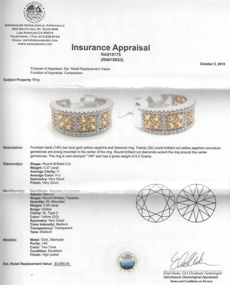 Fourteen karat (14K) two tone gold yellow sapphire and diamond ring. Twenty (20) round brilliant cut yellow sapphire corundum gemstones ae prong mounted in the center of the ring. Round brilliant cut diamonds accent the ring around the center gemstones. The ring is cast stamped "14K" and has a gross weight of 6.2 Grams. Diamond(s): Shape: Round Brilliant Cut. Weight: 0.37 carat. Average Clarity: I1. Average Color: H-J. Symmetry: Very Good. Polish: Very Good. GemStone(s): GemStone: Sapphire Corundum. Nature: Natural. Shape: Round Brilliant, Faceted. Quantity: 20, Mounted. Weight: 0.95 carat. Bulge: Visible. Clarity: SI, Type 2. Color: Yellow: (2/3). Symmetry: Very Good. Color Intensity: Medium. Transparency: Transparent. Tone: Medium. Metal(s): Metal: Gold, Stamped. Purity: 14K. Color: Two Tone. Condition: Excellent. Finish: High polish. GGA Appraised.