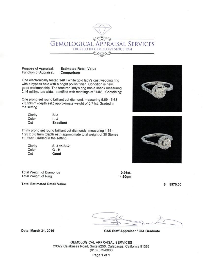 One electronically tested 14KT white gold lady's cast wedding ring with a bypass halo with a bright polish finish. The featured lady's ring has a shank measuring 2.46 millimeters wide. Identified with markings of "14K". Condition is new, good workmanship. Containing: One prong set round brilliant cut diamond, measuring 5.69 - 5.68 x 3.53mm (depth est.) approximate weight of 0.71ct. Graded in the setting. Clarity: SI-1. Color: I - Excellent Thirty prong set round brilliant cut diamonds, measuring 1.35 - 1.25 x 0.81mm (depth est.) approximate total weight of 30 Stones = 0.25ct. Graded in the setting. Clarity: SI-1 to SI-2. Color: G - Good. Total Weight of Diamonds 0.96ct. Total Weight of Ring 4.50gm GAS Appraised.