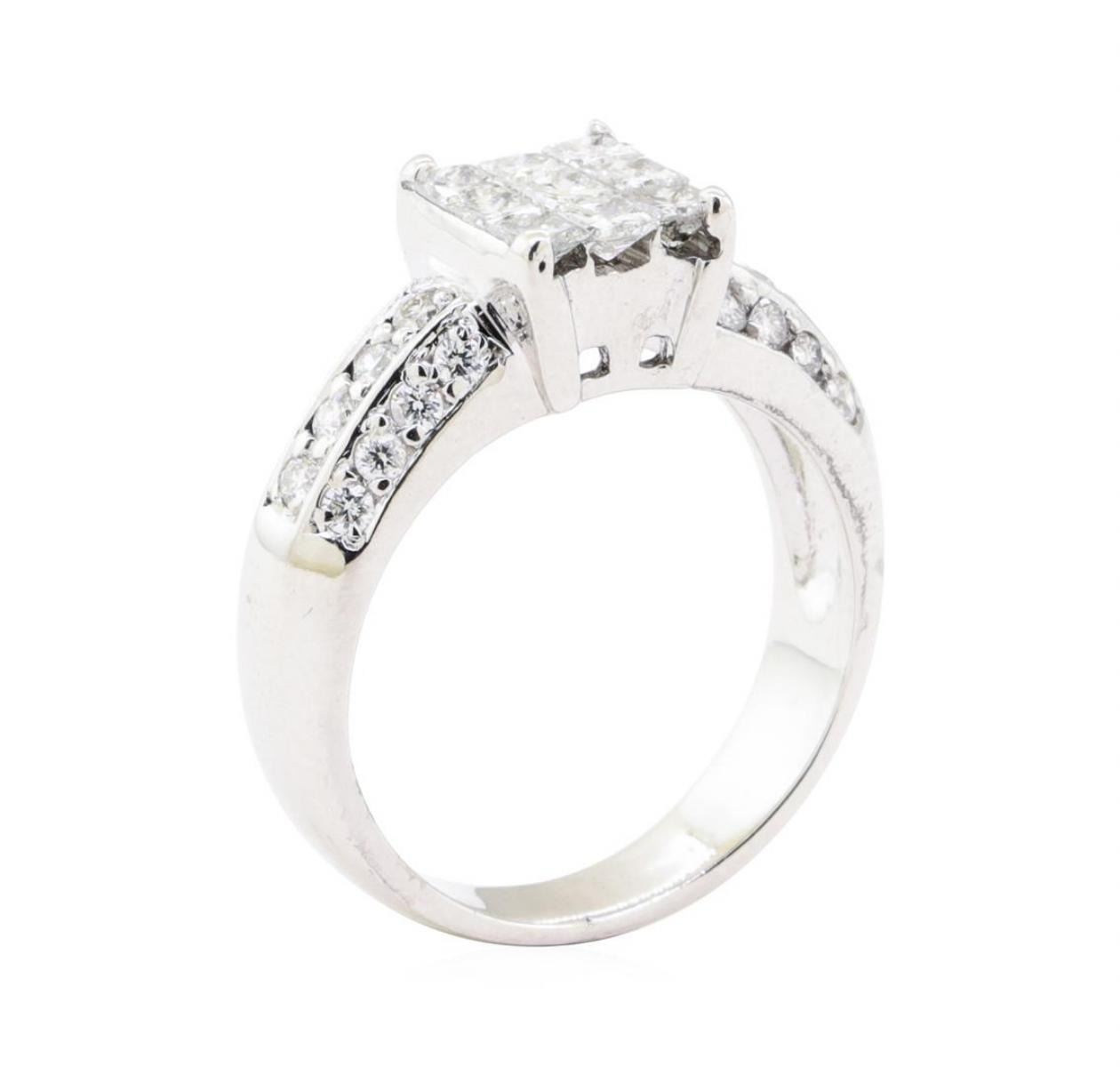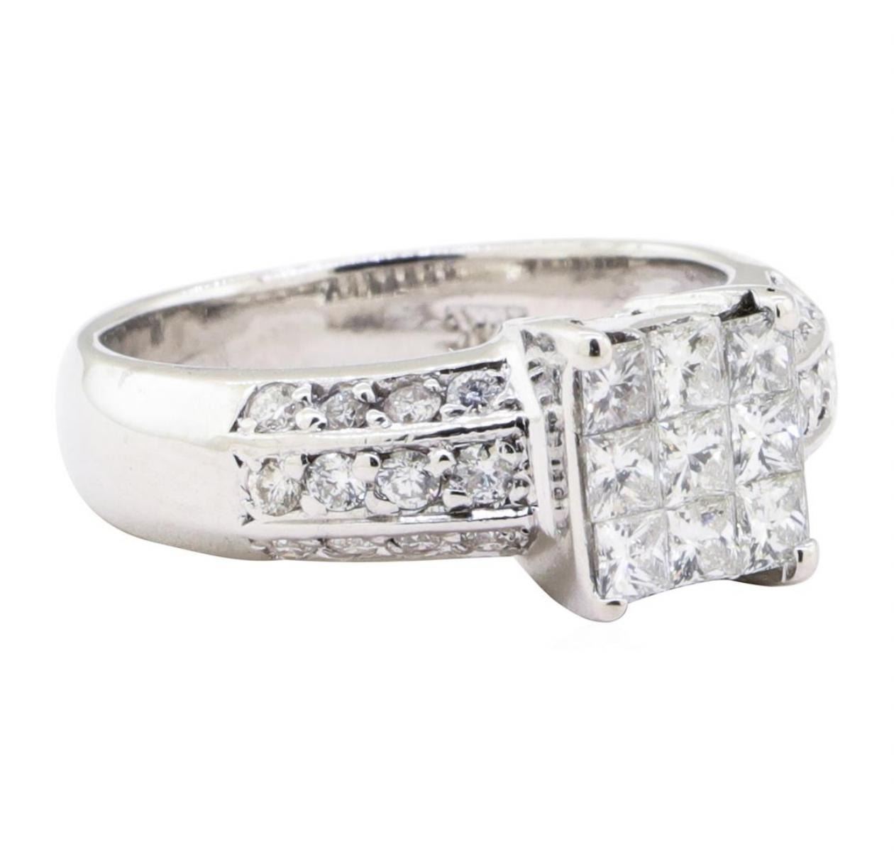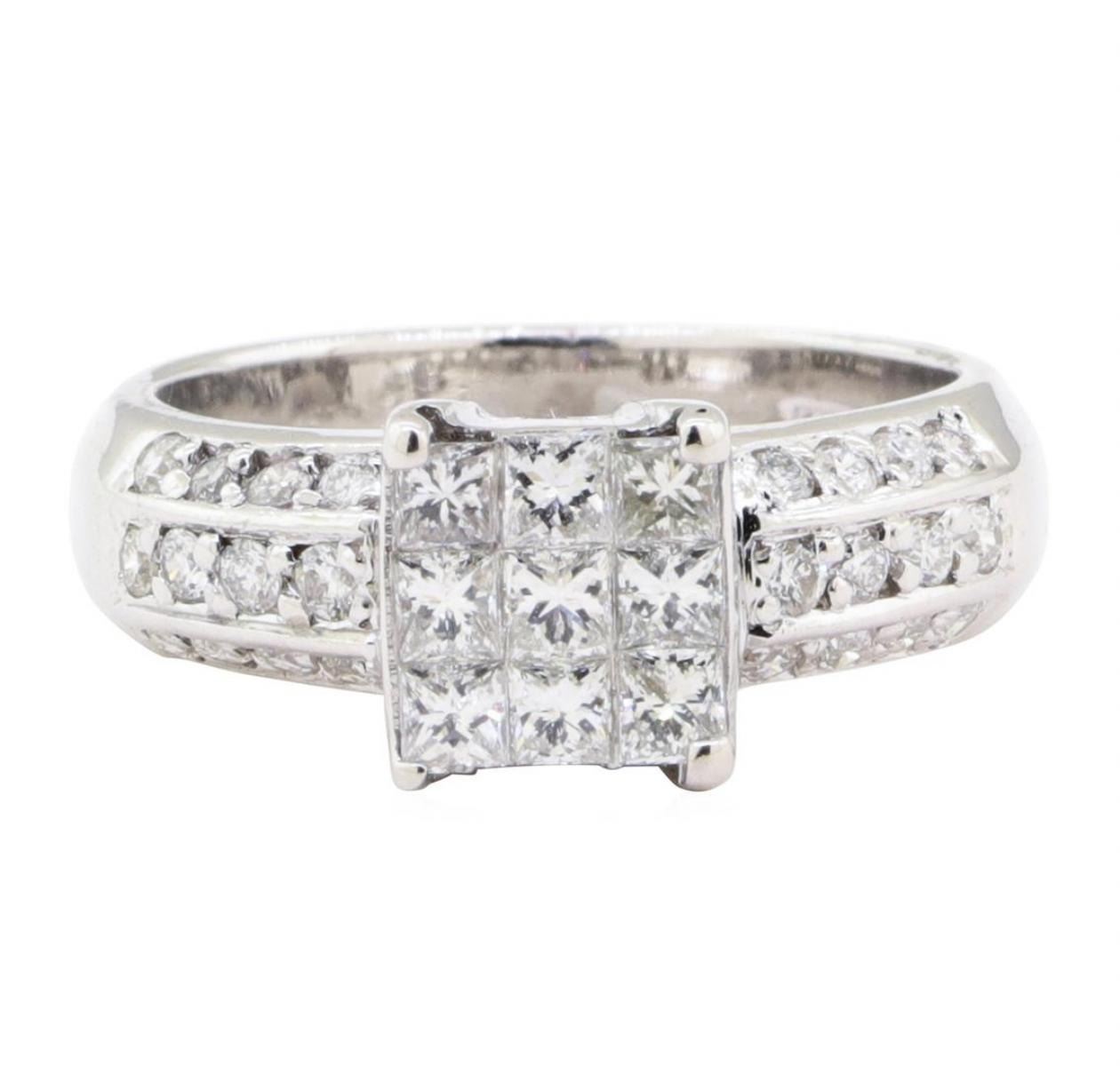 One electronically tested 14KT white gold lady's cast fashion ring with a cathedral shank with a bright polish finish. The featured lady's ring has a shank measuring 3.30 millimeters wide. Identified with markings of '14K'. Condition is Good. Containing: Nine invisible set princess cut diamonds, measuring 2.20 x 2.15 x 1.61mm (depth est.) approximate total weight of 9 Stones = 0.56ct. Graded in the setting. Color H - I Clarity SI-1 to SI-2 Cut Very Good Twenty-Four prong set round brilliant cut diamonds, measuring 1.70 - 1.50 x 0.99mm (depth est.) approximate total weight of 24 Stones = 0.40ct. Graded in the setting. Color H - I Clarity SI-2 to I-1 Cut Very Good. Total Weight of Diamonds 0.96ct.. Total Weight of Ring 4.90gm GAS Appraised at $2705.00. GAS Appraised.