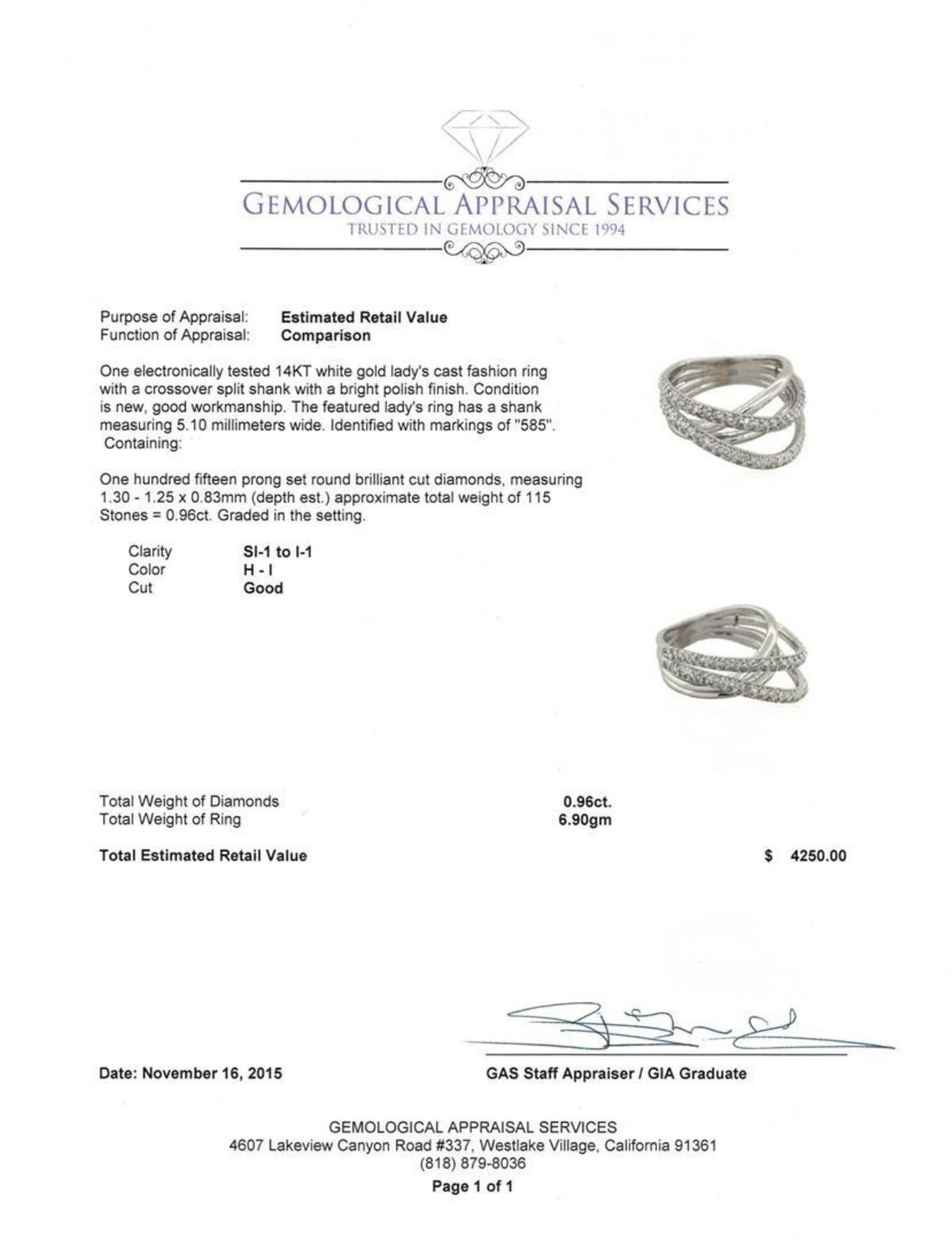 One electronically tested 14KT white gold lady's cast fashion ring with a crossover split shank with a bright polish finish. The featured lady's ring has a shank measuring 5.10 millimeters wide. Identified with markings of "585". Condition is new, good workmanship. Containing: One Hundred Fifteen prong set round brilliant cut diamonds, measuring 1.30 - 1.25 x 0.83mm (depth est.) approximate total weight of 115 Stones = 0.96ct. Graded in the setting. Clarity: SI-1 to I-1. Color: H - I. Cut Good. Total Weight of Diamonds 0.96ct. Total Weight of Ring 6.90gm. GAS Appraised.