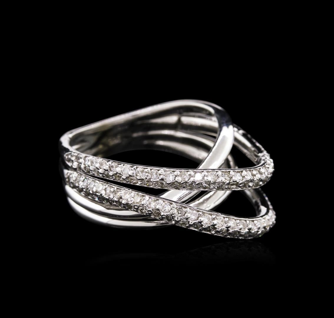 One electronically tested 14KT white gold lady's cast fashion ring with a crossover split shank with a bright polish finish. The featured lady's ring has a shank measuring 5.10 millimeters wide. Identified with markings of "585". Condition is new, good workmanship. Containing: One Hundred Fifteen prong set round brilliant cut diamonds, measuring 1.30 - 1.25 x 0.83mm (depth est.) approximate total weight of 115 Stones = 0.96ct. Graded in the setting. Clarity: SI-1 to I-1. Color: H - I. Cut Good. Total Weight of Diamonds 0.96ct. Total Weight of Ring 6.90gm. GAS Appraised.