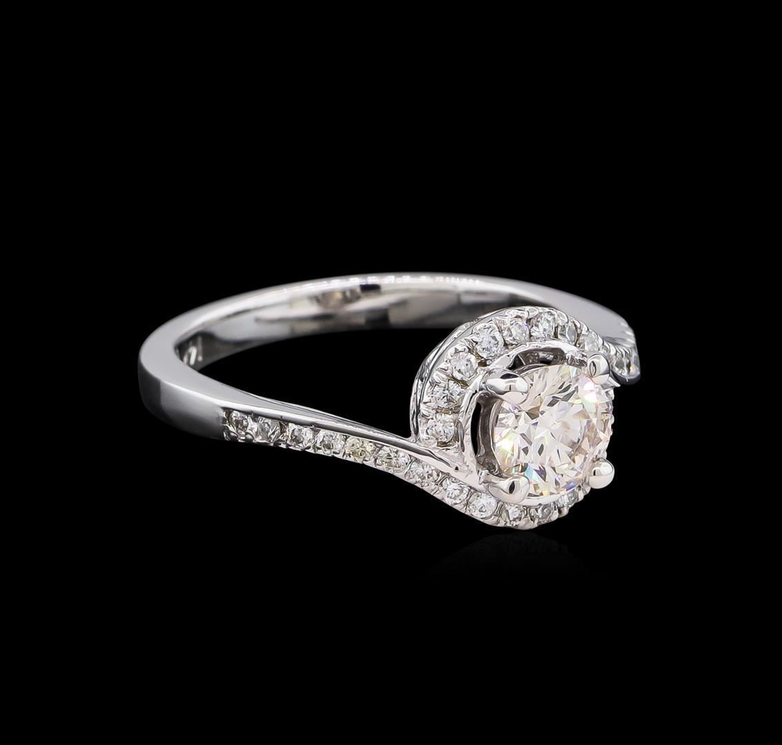 One electronically tested 14KT white gold lady's cast wedding ring with a bypass halo with a bright polish finish. The featured lady's ring has a shank measuring 2.46 millimeters wide. Identified with markings of "14K". Condition is new, good workmanship. Containing: One prong set round brilliant cut diamond, measuring 5.69 - 5.68 x 3.53mm (depth est.) approximate weight of 0.71ct. Graded in the setting. Clarity: SI-1. Color: I - Excellent Thirty prong set round brilliant cut diamonds, measuring 1.35 - 1.25 x 0.81mm (depth est.) approximate total weight of 30 Stones = 0.25ct. Graded in the setting. Clarity: SI-1 to SI-2. Color: G - Good. Total Weight of Diamonds 0.96ct. Total Weight of Ring 4.50gm GAS Appraised.