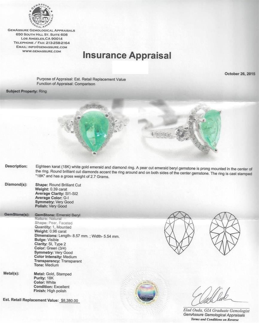 Eighteen karat (18K) white gold emerald and diamond ring. A pear cut emerald beryl gemstone is prong mounted in the center of the ring. Round brilliant cut diamonds accent the ring around and on both sides of the center gemstone. The ring is cast stamped "18K" and has a gross weight of 2.7 Grams. Diamond(s): Shape: Round Brilliant Cut. Weight: 0.39 carat. Average Clarity: I1-I2. Average Color: G-I. Symmetry: Very Good. Polish: Very Good. Gemstone(s): GemStone: Emerald Beryl. Nature: Natural. Shape: Pear, Faceted. Quantity: 1, Mounted. Weight: 0.96 carat. Dimensions: Length-8.57 mm. ; Width- 5.54 mm. Bulge: Visible. Clarity: I1, Type 2. Color: Green (3/4). Symmetry: Very Good. Color Intensity: Medium. Transparency: Transparent. Tone: Medium. Metal(s): Metal: Gold, Stamped. Purity: 18K. Color: White. Condition: Excellent. Finish: High polish. GGA Appraised.