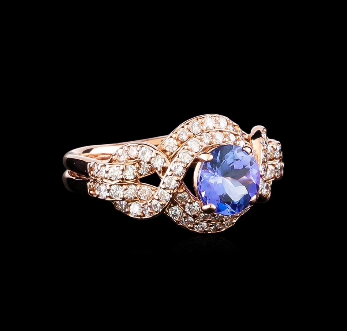 One ring featuring: 14KT rose gold weighing 3.87 grams containing one tanzanite weighing 0.96ct and diamonds weighing 0.68ctw.