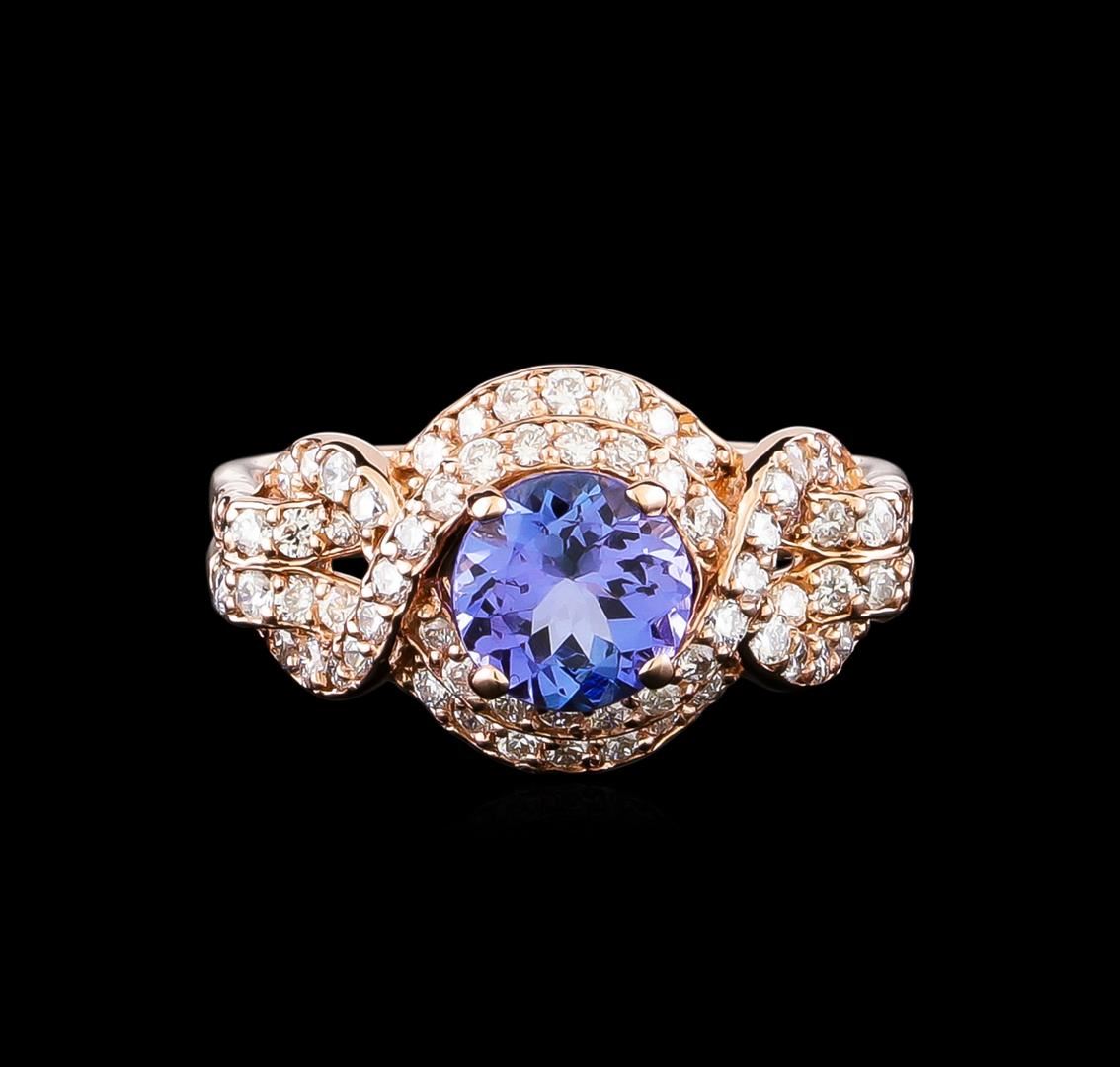 One ring featuring: 14KT rose gold weighing 3.87 grams containing one tanzanite weighing 0.96ct and diamonds weighing 0.68ctw.