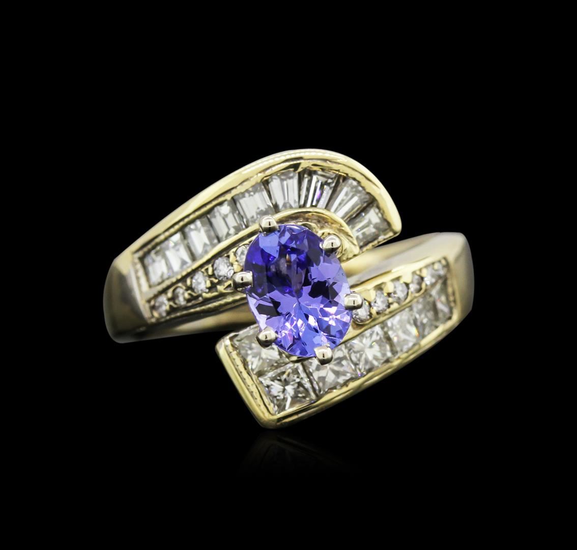 One electronically tested 14KT yellow gold ladies cast tanzanite and diamond ring. The featured tanzanite is set within a stylized diamond set by-pass design, completed by a two and one-half millimeter wide band. Bright polish finish with milgrain detailing. Identified with markings of "14K". Condition is good. Containing: One prong set oval mixed cut natural tanzanite, measuring 7.30 x 5.20 x 3.38mm, approximate weight of 0.93ct., clarity is slightly included, type I, medium dark, moderately strong, bluish violet color, (GIA bV 6/4), cut is good. Transmitting light with a minimum of distortion, transparent. Naturally occurring internal & external characteristics are present. Graded in the setting. Tanzanite is a very rare gemstone that is only found in the country of Tanzania. Originally discovered in 1967. Tiffany & Company, named the stone Tanzanite. It is found in the Usumburu Mountains that border the Umba Valley of northern Tanzania. Tanzanite occurs in gray, brown, violet, blue, reddish-purple, & green. The gem is interesting because of its exceptional pleochroism. Rotated in different directions a tanzanite will exhibit multiple changes of color. Tanzanite has a low tolerance to ultrasonic cleaning, and should not be cleaned using this method. Thirty-One prong & channel set princess, baguette and round brilliant cut diamonds approximate total weight of 31 Stones = 1.00ct. Graded in the setting. Clarity: VS-1 to SI-1. Color: H - J. Total Weight of Colored Stones 0.93ct. Total Weight of Diamonds 1.00ct. Total Weight of Ring 7.49gm. AIG Appraised at $5,920.00.