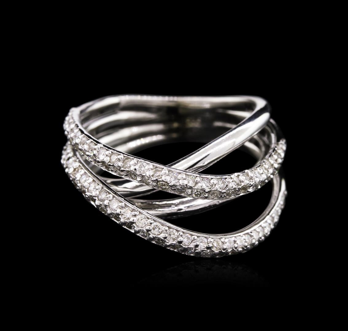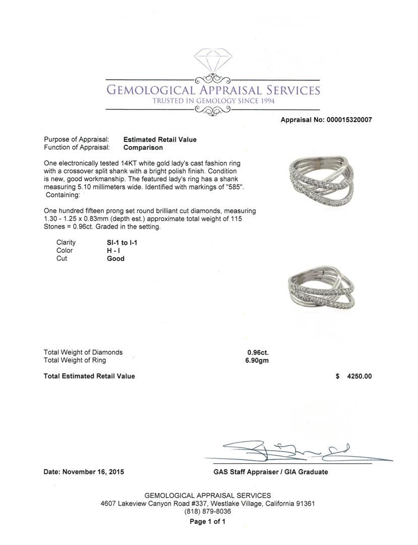 One electronically tested 14KT white gold lady's cast fashion ring with a crossover split shank with a bright polish finish. The featured lady's ring has a shank measuring 5.10 millimeters wide. Identified with markings of "585". Condition is new, good workmanship. Containing: One Hundred Fifteen prong set round brilliant cut diamonds, measuring 1.30 - 1.25 x 0.83mm (depth est.) approximate total weight of 115 Stones = 0.96ct. Graded in the setting. Clarity: SI-1 to I-1. Color: H - I. Cut Good. Total Weight of Diamonds 0.96ct. Total Weight of Ring 6.90gm. GAS Appraised at $4,250.00.