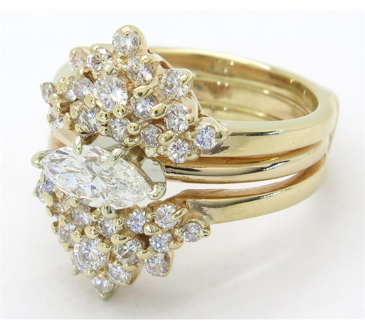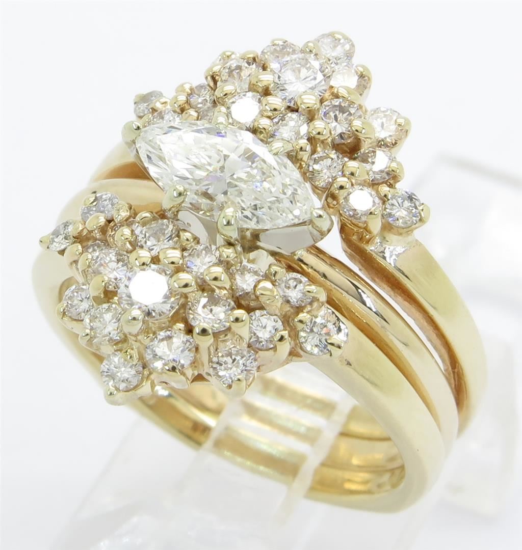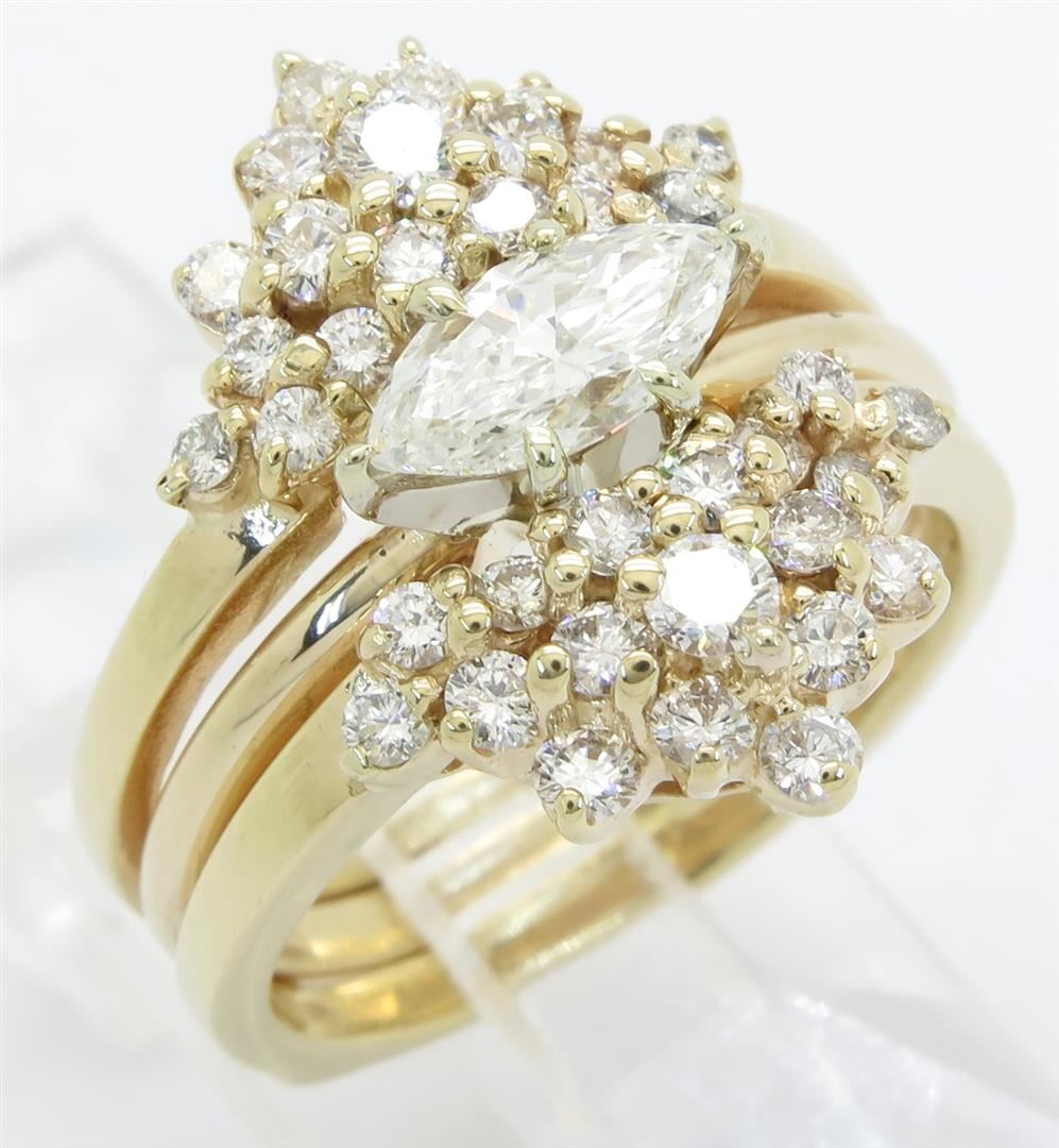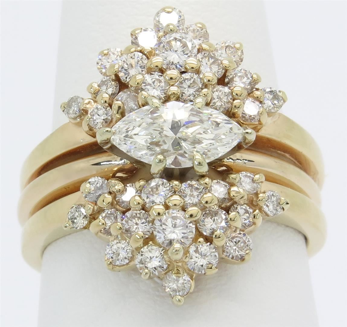 One tested 14K yellow gold diamond ring. Containing: One Marquise Cut Diamond, Size: .34CT, Clarity: SI1, Color: F-G. 36 Round Brilliant Cut Diamonds. Approximate total diamond weight: .96CTW. All diamonds are graded in the mounting unless otherwise stated. Weight of ring: 7.9 grams, Size: 6.0.