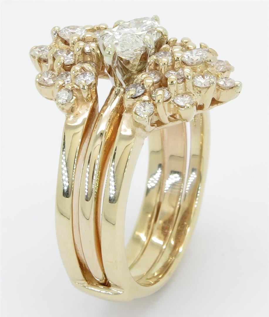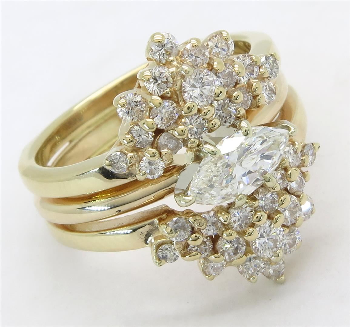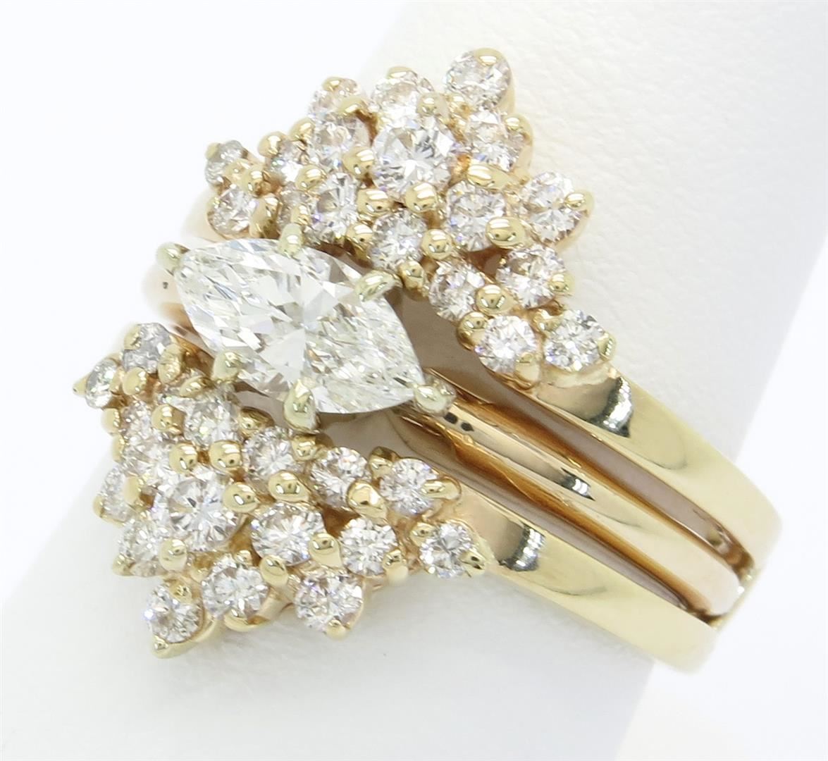 One tested 14K yellow gold diamond ring. Containing: One Marquise Cut Diamond, Size: .34CT, Clarity: SI1, Color: F-G. 36 Round Brilliant Cut Diamonds. Approximate total diamond weight: .96CTW. All diamonds are graded in the mounting unless otherwise stated. Weight of ring: 7.9 grams, Size: 6.0.