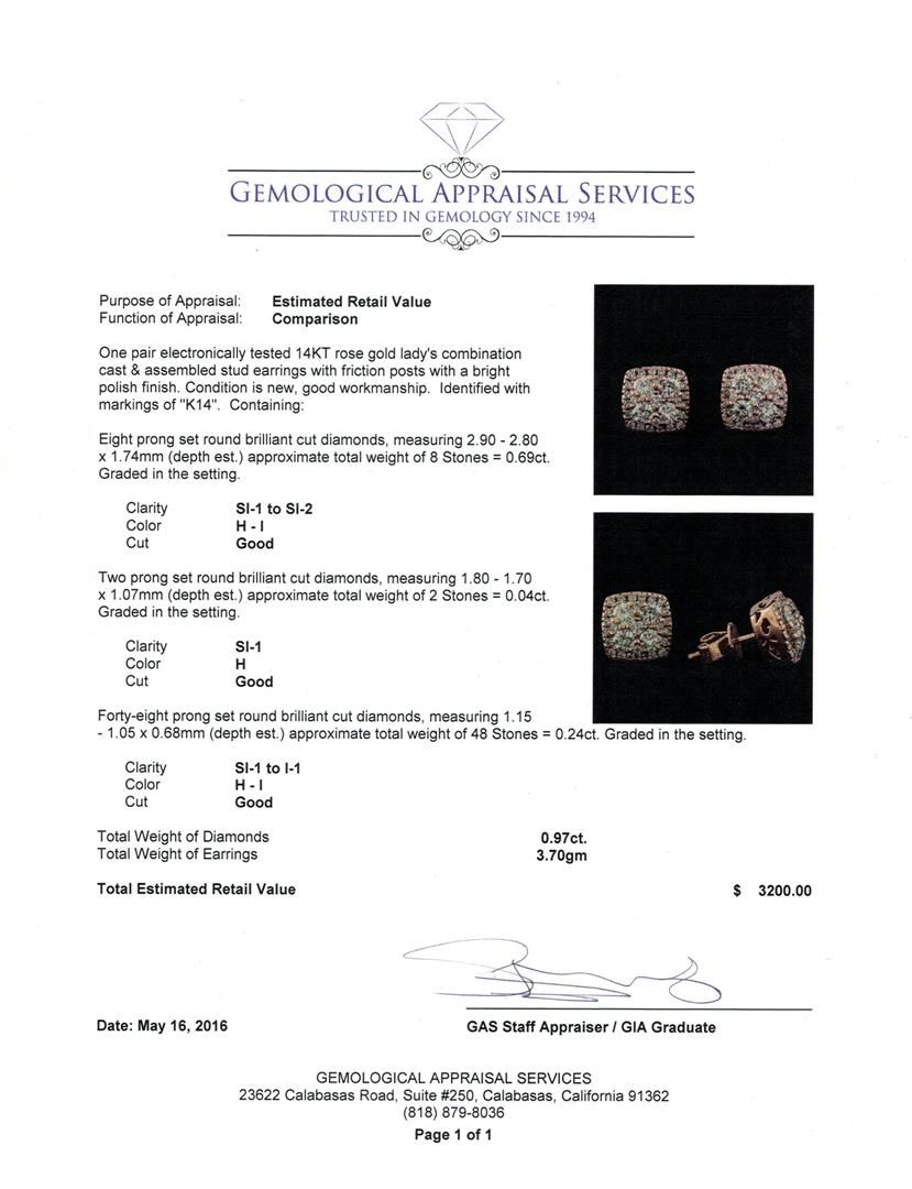 One pair electronically tested 14KT rose gold lady's combination cast & assembled stud earrings with friction posts with a bright polish finish. Identified with markings of "K14". Condition is new, good workmanship. Containing: Eight prong set round brilliant cut diamonds, measuring 2.90 - 2.80 x 1.74mm (depth est.) approximate total weight of 8 Stones = 0.69ct. Graded in the setting. Clarity: SI-1 to SI-2. Color: H - I. Cut Good Two prong set round brilliant cut diamonds, measuring 1.80 - 1.70 x 1.07mm (depth est.) approximate total weight of 2 Stones = 0.04ct. Graded in the setting. Clarity: SI-1. Color: Good Forty-Eight prong set round brilliant cut diamonds, measuring 1.15 - 1.05 x 0.68mm (depth est.) approximate total weight of 48 Stones = 0.24ct. Graded in the setting. Clarity: SI-1 to I-1. Color: H - I. Cut Good. Total Weight of Diamonds 0.97ct. Total Weight of Earrings 3.70gm. GAS Appraised.