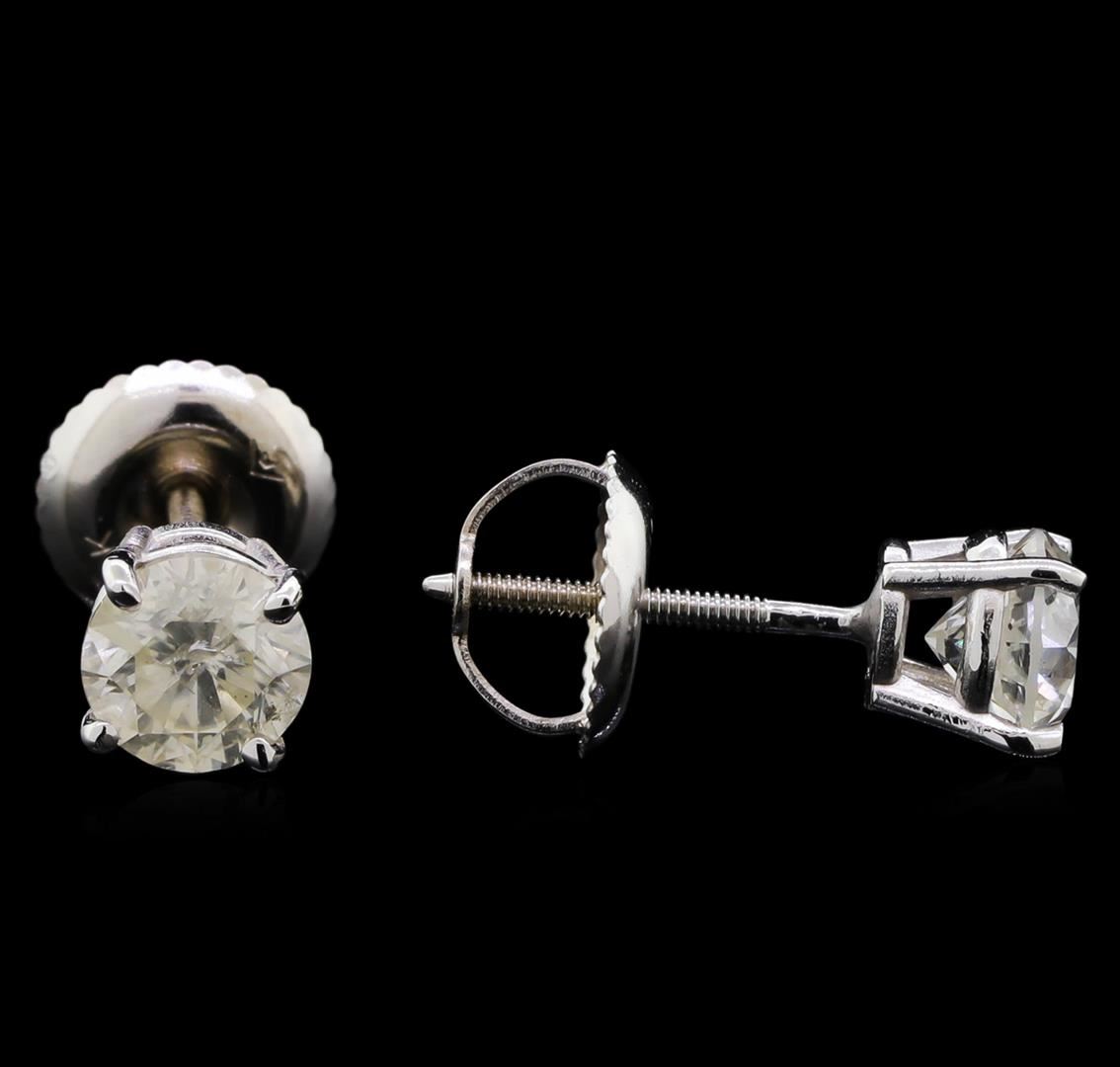 One pair electronically tested 14KT white gold cast & assembled diamond solitaire ring. Bright polish finish. Condition is new, good workmanship. Containing: One prong set round brilliant cut diamond, measuring 4.92 - 4.90 x 3.30mm (depth est.) approximate weight of 0.49ct with a medium blue fluorescence. Graded in the setting. Clarity: I-1. Color: I. Depth 67.2%. Table 57.0%. One prong set round brilliant cut diamond, measuring 4.82 - 4.80 x 3.10mm (depth est.), 6.00.%. GTCF approximate weight of 0.48ct with a medium blue fluorescence. Graded in the setting. Clarity: I-2. Color: J. Depth 64.5%. Table 56.1%. Total Weight of Diamonds 0.97ct. Total Weight of Ring 1.09gm. AIG Appraised at $2,745.00.