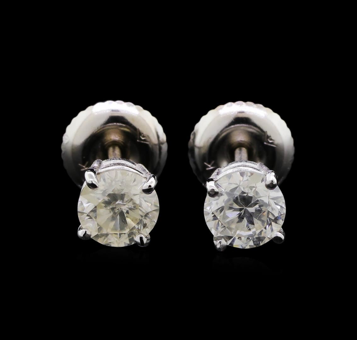 One pair electronically tested 14KT white gold cast & assembled diamond solitaire ring. Bright polish finish. Condition is new, good workmanship. Containing: One prong set round brilliant cut diamond, measuring 4.92 - 4.90 x 3.30mm (depth est.) approximate weight of 0.49ct with a medium blue fluorescence. Graded in the setting. Clarity: I-1. Color: I. Depth 67.2%. Table 57.0%. One prong set round brilliant cut diamond, measuring 4.82 - 4.80 x 3.10mm (depth est.), 6.00.%. GTCF approximate weight of 0.48ct with a medium blue fluorescence. Graded in the setting. Clarity: I-2. Color: J. Depth 64.5%. Table 56.1%. Total Weight of Diamonds 0.97ct. Total Weight of Ring 1.09gm. AIG Appraised at $2,745.00.