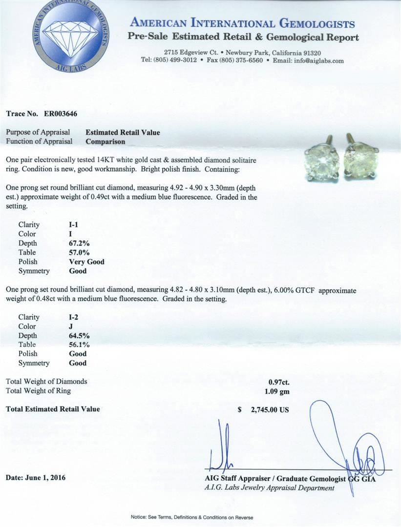 One pair electronically tested 14KT white gold cast & assembled diamond solitaire ring. Bright polish finish. Condition is new, good workmanship. Containing: One prong set round brilliant cut diamond, measuring 4.92 - 4.90 x 3.30mm (depth est.) approximate weight of 0.49ct with a medium blue fluorescence. Graded in the setting. Clarity: I-1. Color: I. Depth 67.2%. Table 57.0%. One prong set round brilliant cut diamond, measuring 4.82 - 4.80 x 3.10mm (depth est.), 6.00.%. GTCF approximate weight of 0.48ct with a medium blue fluorescence. Graded in the setting. Clarity: I-2. Color: J. Depth 64.5%. Table 56.1%. Total Weight of Diamonds 0.97ct. Total Weight of Ring 1.09gm. AIG Appraised at $2,745.00.