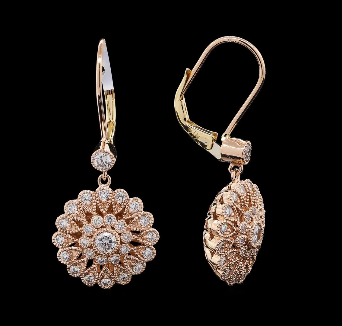 One pair electronically tested 14KT yellow, white, and rose gold lady's combination cast & assembled starburst design dangle earrings with lever backs with a bright polish with milgrain detailing finish. Identified with markings of 'K14'. Condition is new, good workmanship. Containing: Two bezel set round brilliant cut diamonds, measuring 3.00 - 2.95 x 1.85mm (depth est.) approximate total weight of 2 Stones = 0.20ct. Graded in the setting. Clarity SI-2 to I-1. Color: G - H Cut Very Good Two bezel set round brilliant cut diamonds, measuring 2.80 - 2.75 x 1.72mm (depth est.) approximate total weight of 2 Stones = 0.16ct. Graded in the setting. Clarity VS-2 to SI-1. Color: G - H Cut Very Good Thirty-Two prong set round brilliant cut diamonds, measuring 1.60 - 1.55 x 0.95mm (depth est.) approximate total weight of 32 Stones = 0.46ct. Graded in the setting. Clarity VS-2 to SI-2. Color: G - I Cut Good Twenty prong set round brilliant cut diamonds, measuring 1.30 - 1.25 x 0.77mm (depth est.) approximate total weight of 20 Stones = 0.15ct. Graded in the setting. Clarity SI-1 to SI-2. Color: H - I Cut Good. Total Weight of Diamonds 0.97ct.. Total Weight of Earrings 7.00gm. GAS Appraised at $3,905.00.
