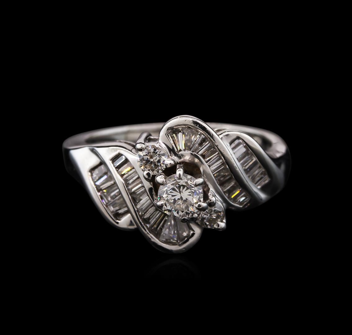 One electronically tested 14KT white gold lady's cast ring with a tapered shank with a bright polish finish. The featured lady's ring has a 1.80 millimeter wide shank. Identified with markings of "14K". Condition is new, good workmanship. Containing: One prong set round brilliant cut diamond, measuring 3.75 - 3.70 x 2.24mm (depth est.) approximate weight of 0.20ct. Graded in the setting. Clarity: VS-2. Color: Good Two prong set round brilliant cut diamonds, measuring 2.50 - 2.40 x 1.59mm (depth est.) approximate. Total Weight of 2 Stones = 0.12ct. Graded in the setting. Clarity: SI-1. Color: H - I. Cut Good Thirty channel set baguette cut diamonds, measuring from 1.40 x 1.40 x 0.74mm (depth est.) to 2.35 x 2.00 x 1.00mm (depth est.) approximate. Total Weight of 30 Stones = 0.65ct. Graded in the setting. Clarity: VS-2 to SI-1. Color: H - I. Cut Good. Total Weight of Diamonds 0.97ct. Total Weight of Ring 4.40gm. GAS Appraised at $4,030.00.