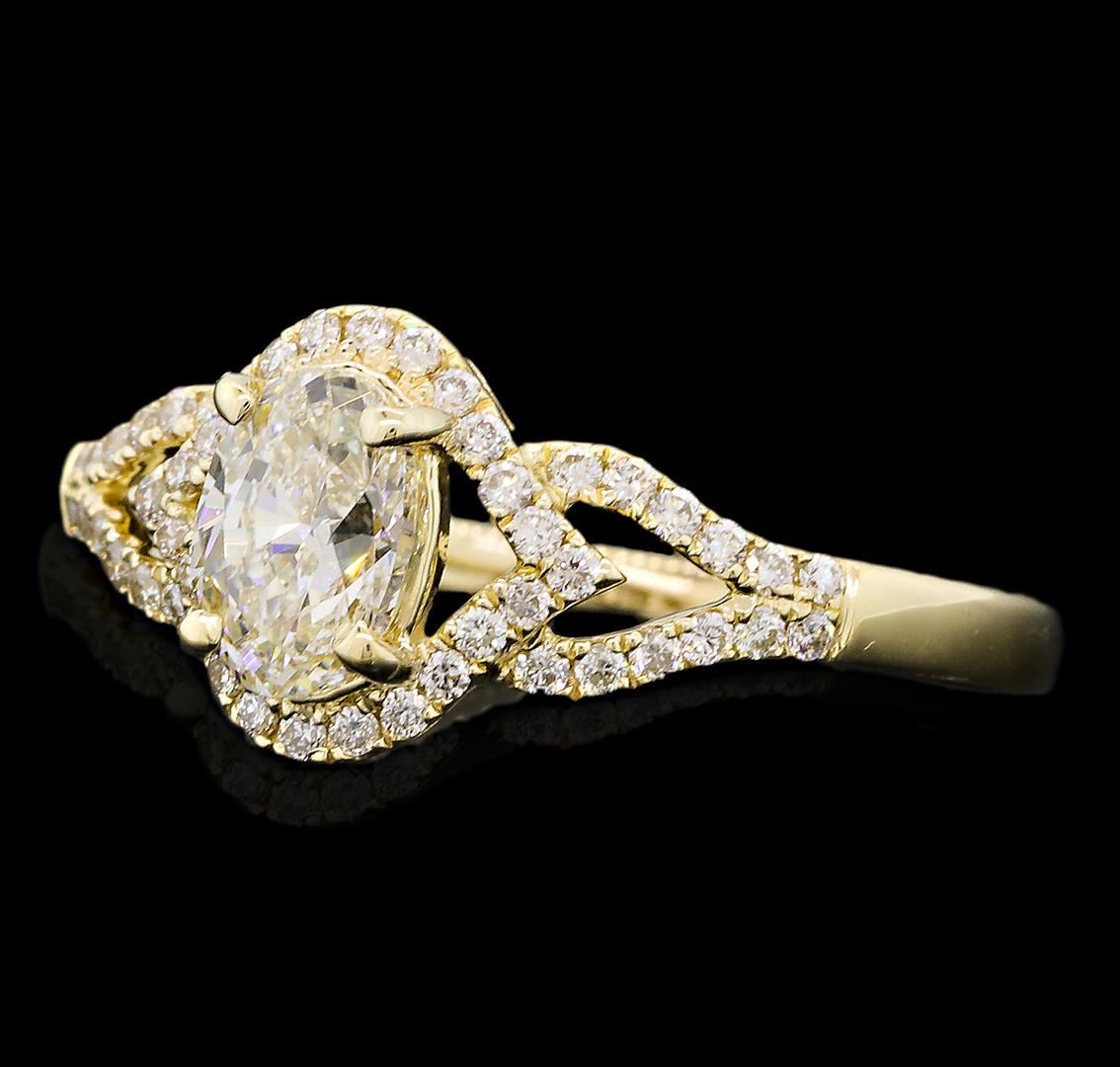 One electronically tested 14KT yellow gold lady's cast wedding ring with a split bypass shank with a bright polish finish. The featured lady's ring has a shank measuring 1.57 millimeters wide. Identified with markings of '14K'. Condition is new, good workmanship. Containing: One prong set oval shaped cut diamond, measuring 6.55 x 4.52 x 3.30mm (depth est.) , 10.00.%. GTCF approximate weight of 0.71ct. Graded in the setting. Color K - L Clarity VS-1 Cut Very Good Forty-Eight prong set round brilliant cut diamonds, measuring 1.20 - 1.10 x 0.69mm (depth est.) approximate total weight of 48 Stones = 0.26ct. Graded in the setting. Color H - I Clarity SI-1 to SI-2 Cut Very Good. Total Weight of Diamonds 0.97ct.. Total Weight of Ring 2.60gm GAS Appraised at $5,965.00.