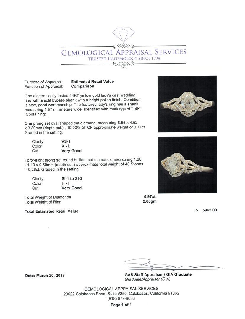 One electronically tested 14KT yellow gold lady's cast wedding ring with a split bypass shank with a bright polish finish. The featured lady's ring has a shank measuring 1.57 millimeters wide. Identified with markings of '14K'. Condition is new, good workmanship. Containing: One prong set oval shaped cut diamond, measuring 6.55 x 4.52 x 3.30mm (depth est.) , 10.00.%. GTCF approximate weight of 0.71ct. Graded in the setting. Color K - L Clarity VS-1 Cut Very Good Forty-Eight prong set round brilliant cut diamonds, measuring 1.20 - 1.10 x 0.69mm (depth est.) approximate total weight of 48 Stones = 0.26ct. Graded in the setting. Color H - I Clarity SI-1 to SI-2 Cut Very Good. Total Weight of Diamonds 0.97ct.. Total Weight of Ring 2.60gm GAS Appraised at $5,965.00.