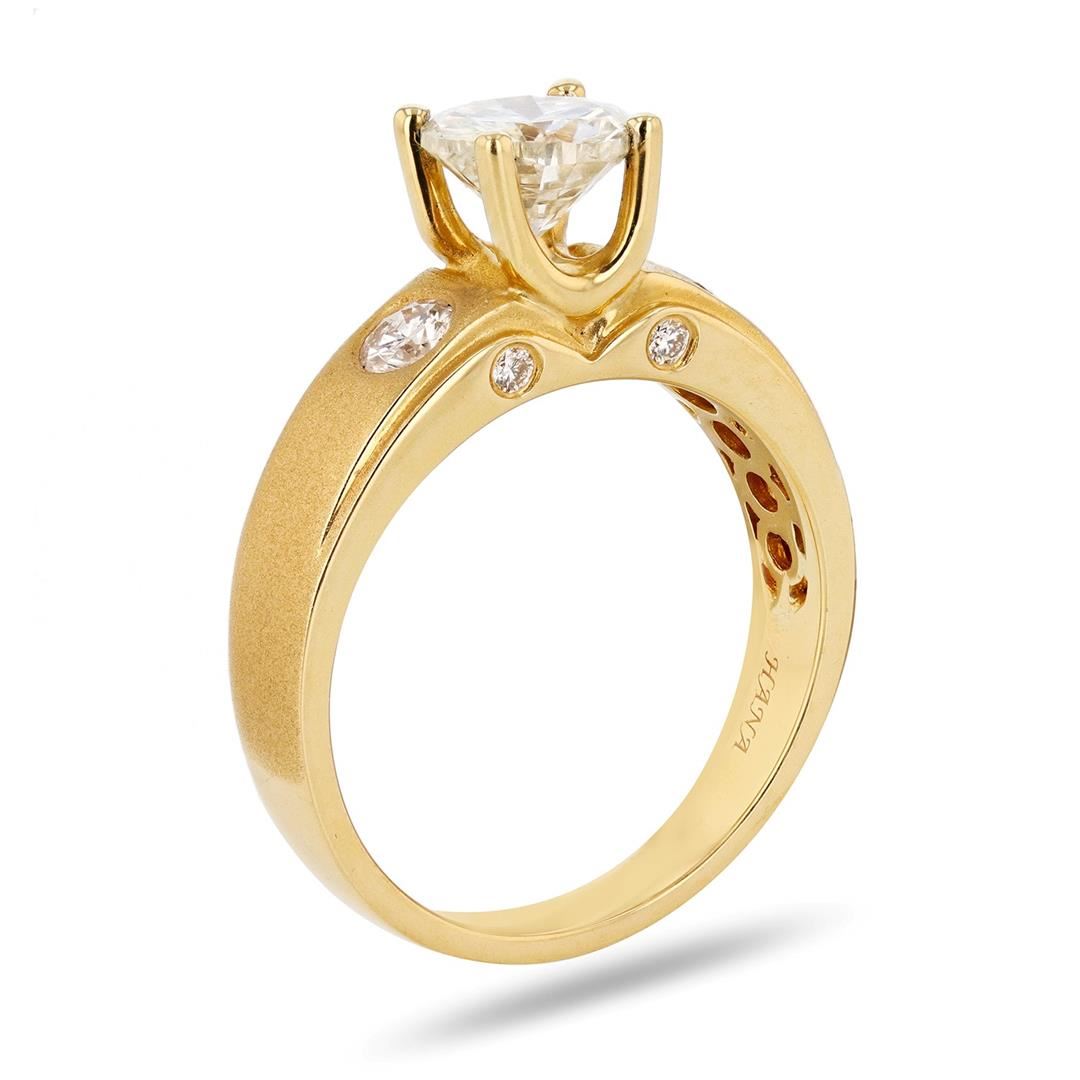 One electronically tested 18KT yellow gold ladies cast diamond unity ring. Condition is new, good workmanship. The featured cathedral set diamond is supported by a diamond set under gallery and accented by a single diamond on either side, completed by a two and one-half millimeter wide band. Bright and satin finish. Trademark is Hana. Identified with markings of "18K". Containing: One prong set round brilliant cut diamond, measuring 6.27 - 5.97 x 3.94mm exact weight 0.97ct with a faint fluorescence. EGL Platinum Report attached. Graded loose prior to setting in the EGL Laboratory Report #1661055428. Clarity SI-2 Color I Depth 64.4% Table 68.0% Polish Good Symmetry Poor Six flush set round brilliant cut diamonds approximate total weight of 6 Stones = 0.29ct. Graded in the setting. Clarity VS-2 to SI-1 Color F-G Total Weight of Diamonds 1.26ct. Total Weight of Ring 5.63 gm