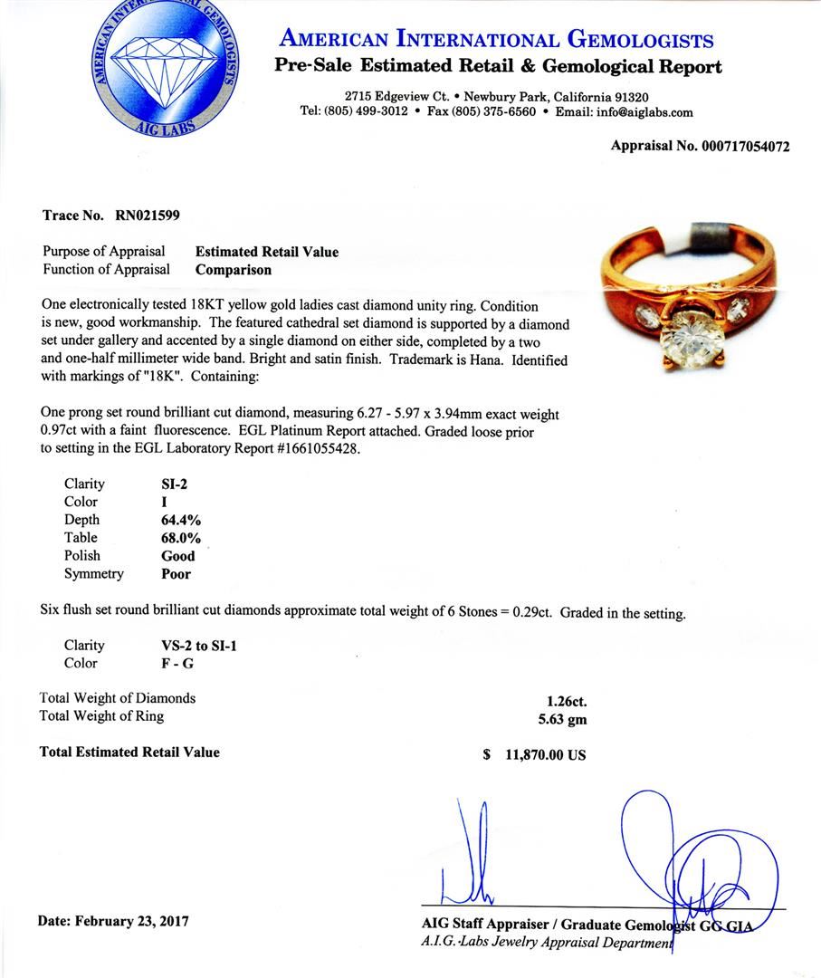 One electronically tested 18KT yellow gold ladies cast diamond unity ring. Condition is new, good workmanship. The featured cathedral set diamond is supported by a diamond set under gallery and accented by a single diamond on either side, completed by a two and one-half millimeter wide band. Bright and satin finish. Trademark is Hana. Identified with markings of "18K". Containing: One prong set round brilliant cut diamond, measuring 6.27 - 5.97 x 3.94mm exact weight 0.97ct with a faint fluorescence. EGL Platinum Report attached. Graded loose prior to setting in the EGL Laboratory Report #1661055428. Clarity SI-2 Color I Depth 64.4% Table 68.0% Polish Good Symmetry Poor Six flush set round brilliant cut diamonds approximate total weight of 6 Stones = 0.29ct. Graded in the setting. Clarity VS-2 to SI-1 Color F-G Total Weight of Diamonds 1.26ct. Total Weight of Ring 5.63 gm