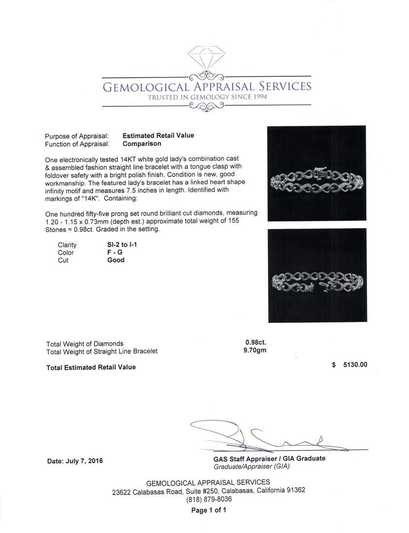 One electronically tested 14KT white gold lady's combination cast & assembled fashion straight line bracelet with a tongue clasp with foldover safety with a bright polish finish. The featured lady's bracelet has a linked heart shape infinity motif and measures 7.5 inches in length. Identified with markings of '14K'. Condition is new, good workmanship. Containing: One Hundred Fifty-Five prong set round brilliant cut diamonds, measuring 1.20 - 1.15 x 0.73mm (depth est.) approximate total weight of 155 Stones = 0.98ct. Graded in the setting. Clarity SI-2 to I-1. Color: F - G Cut Good. Total Weight of Diamonds 0.98ct.. Total Weight of Straight Line Bracelet 9.70gm. GAS Appraised at $5,130.00.
