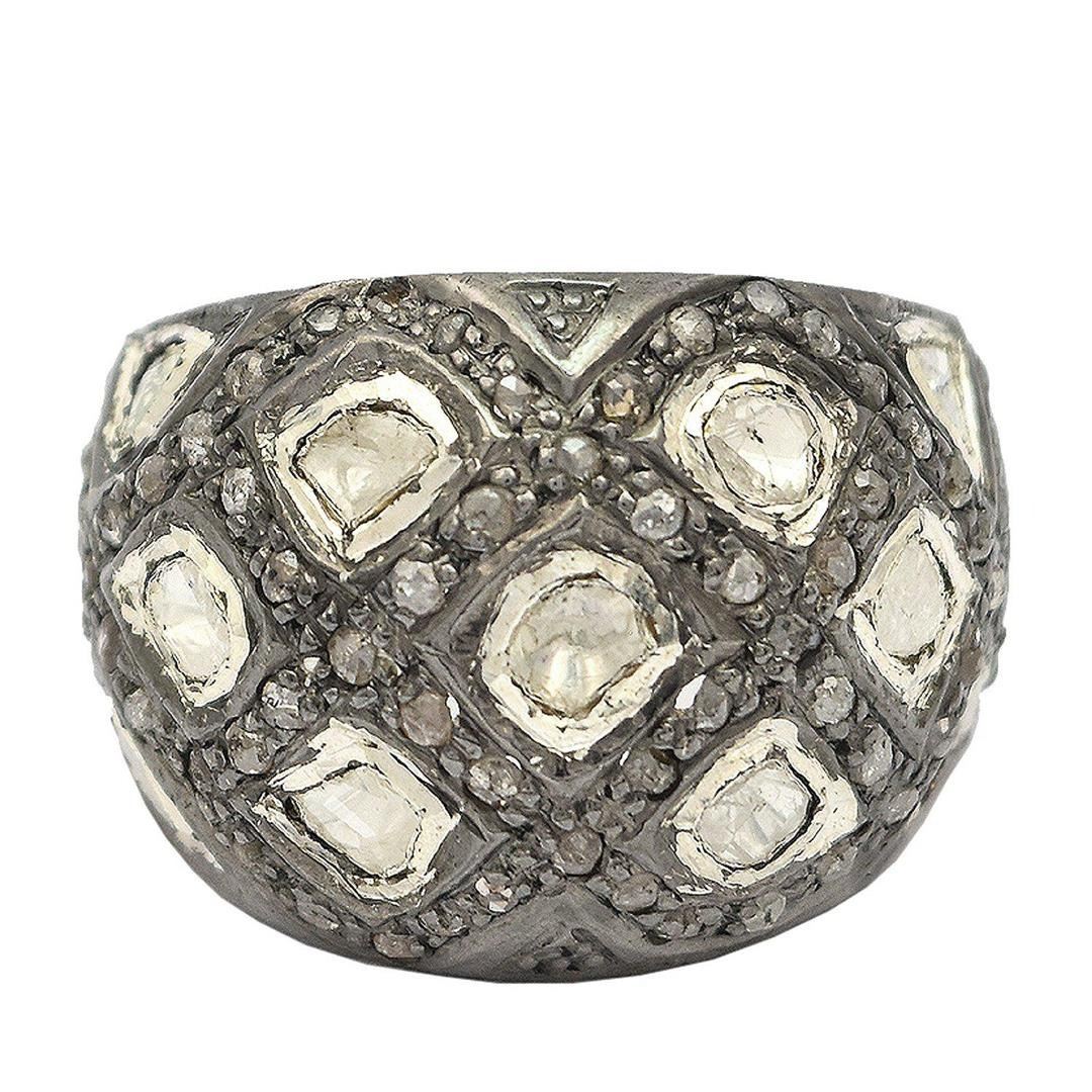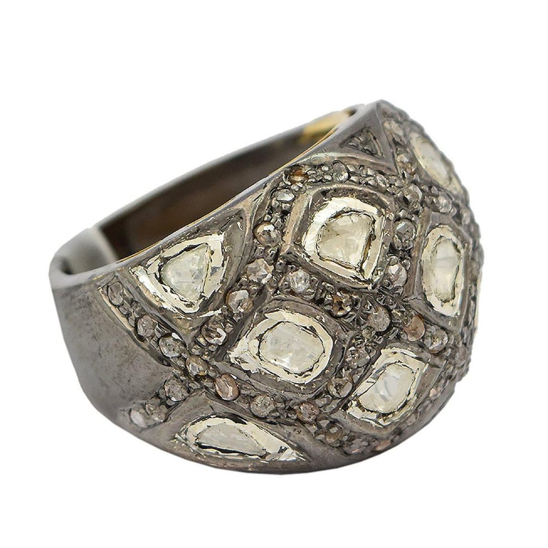 One electronically tested silver and gold ladies custom cast & assembled diamond ring. The ring features a diamond encrusted curvature supported by tapering shoulders, completed by a five millimeter wide band. Bright and anodized finish. Condition is new,